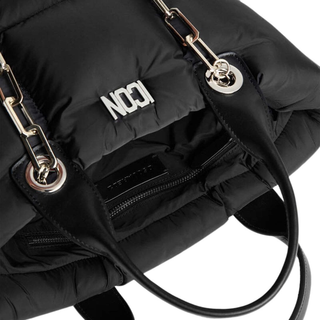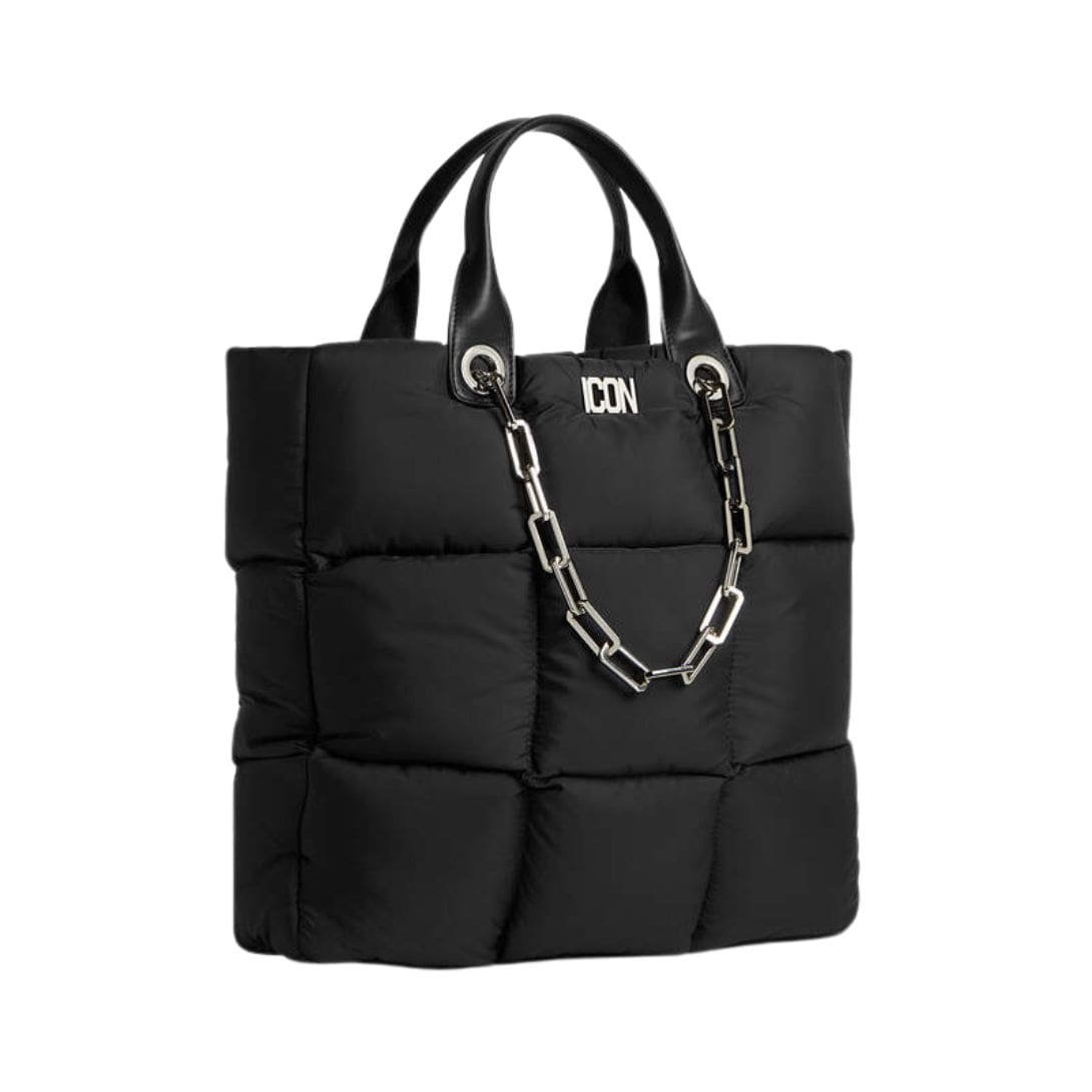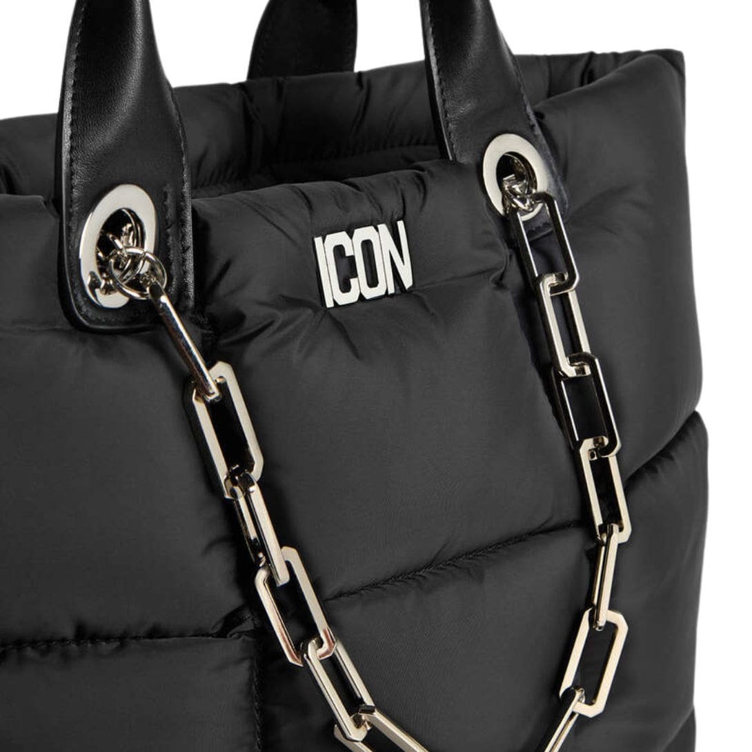 The exterior of the bag is constructed from high-quality, durable materials that ensure longevity while maintaining a sophisticated look. The sleek black finish is adorned with the iconic DSQUARED2 branding in bold white lettering, creating a striking contrast that captures attention. The word “ICON” prominently features, underscoring the bag’s statement-making design and aligning with the brand’s reputation for bold and expressive fashion.