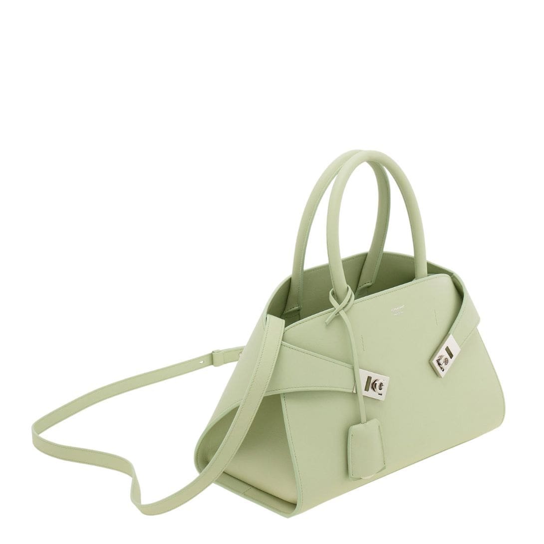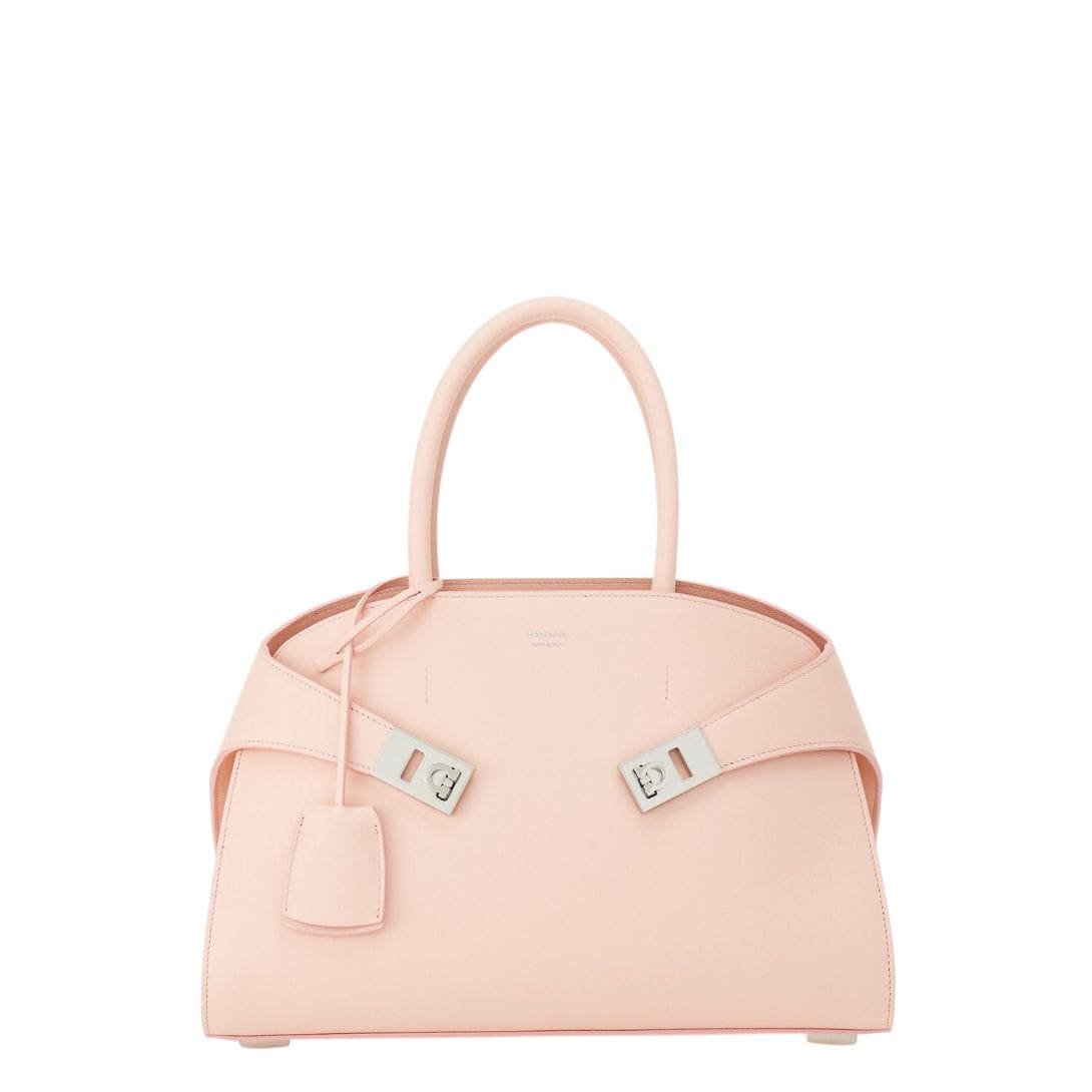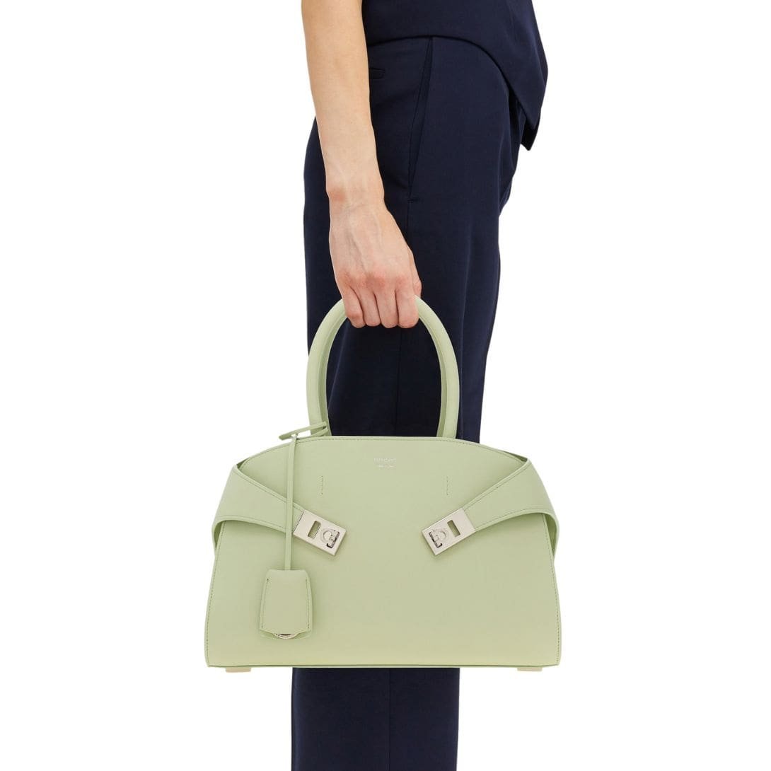 Adding a subtle touch of sophistication is the tonal leather fob adorning the rigid top handle, a testament to Ferragamo’s commitment to meticulous craftsmanship and attention to detail. Rectangular foot studs not only protect the bag but also serve as a confirmation of its iconic status, further elevating its appeal.
