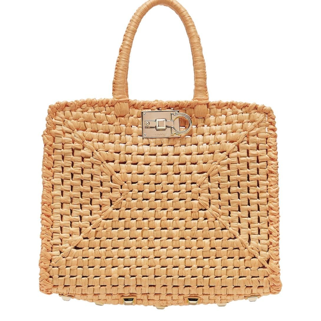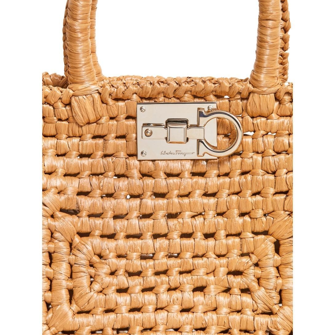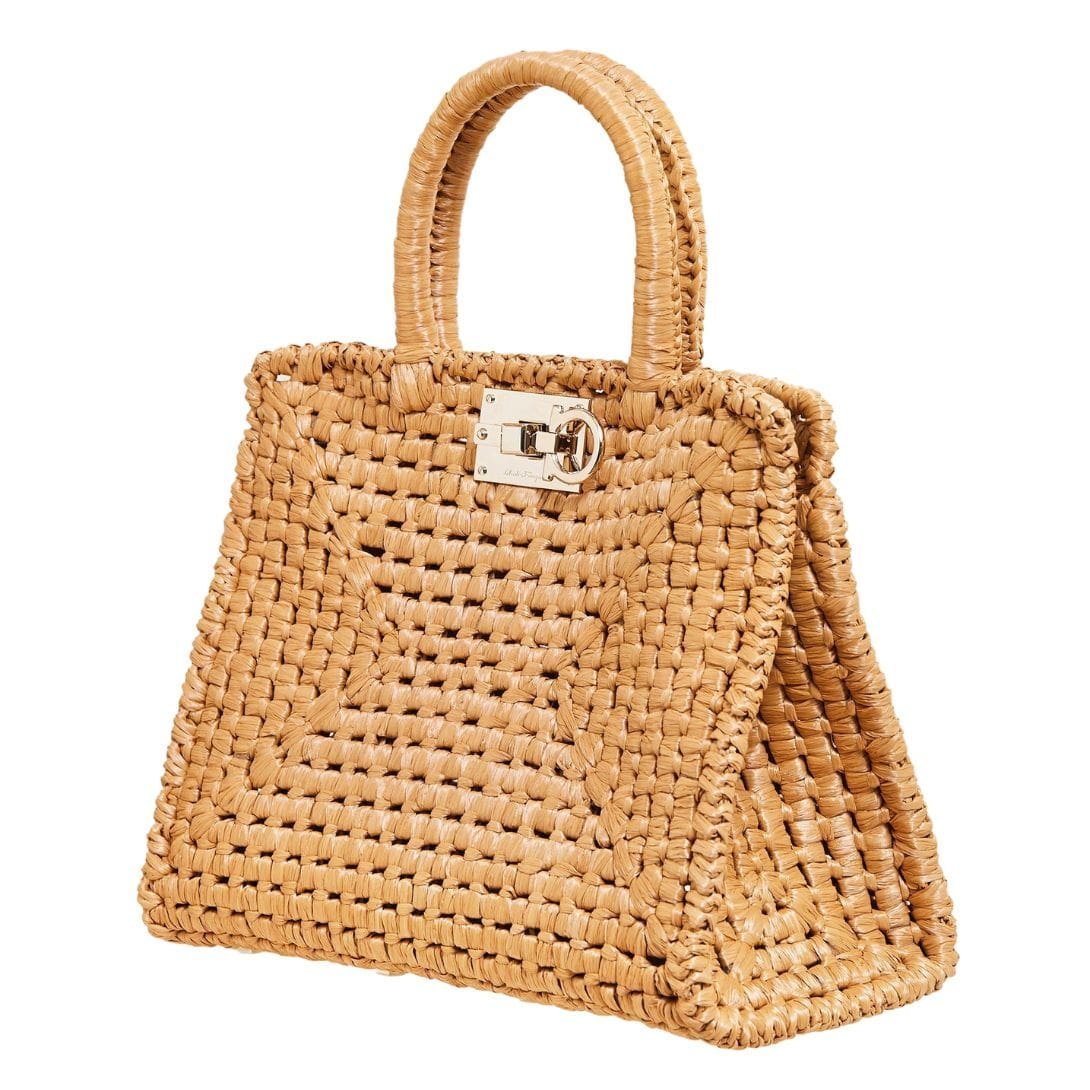 In summation, the Ferragamo Studio Box bag in its summery raffia incarnation is a celebration of both style and craftsmanship. With its handwoven structure, iconic details, and versatile functionality, it embodies the spirit of the season and promises to be a cherished companion for sun-soaked adventures and balmy evenings alike.