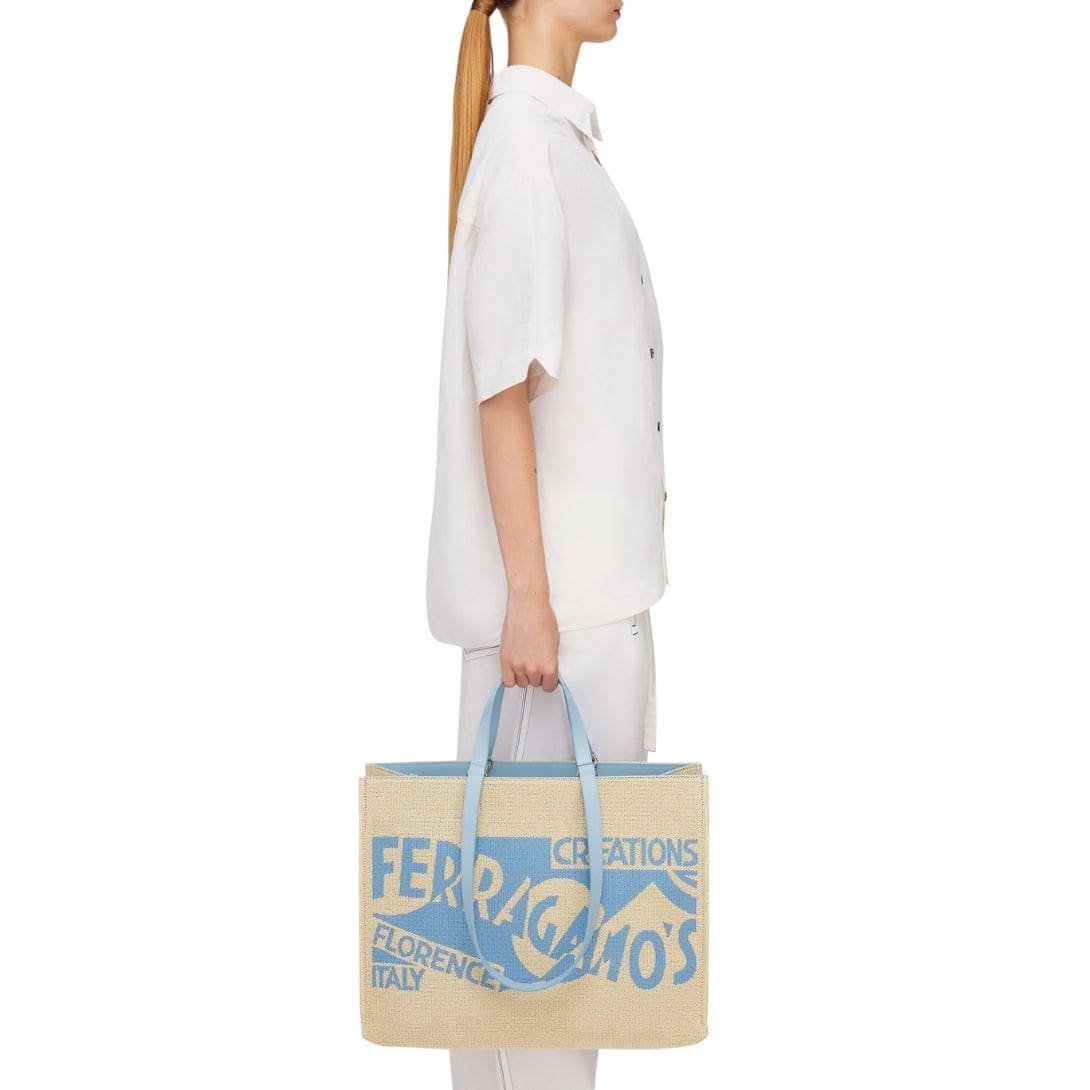 Crafted from a harmonious blend of woven cotton and raffia, the tote exudes a natural, summery allure that effortlessly transitions from city streets to sun-kissed beaches. The intricate weaving technique not only adds texture and depth but also reflects Ferragamo’s commitment to artisanal craftsmanship and attention to detail.
