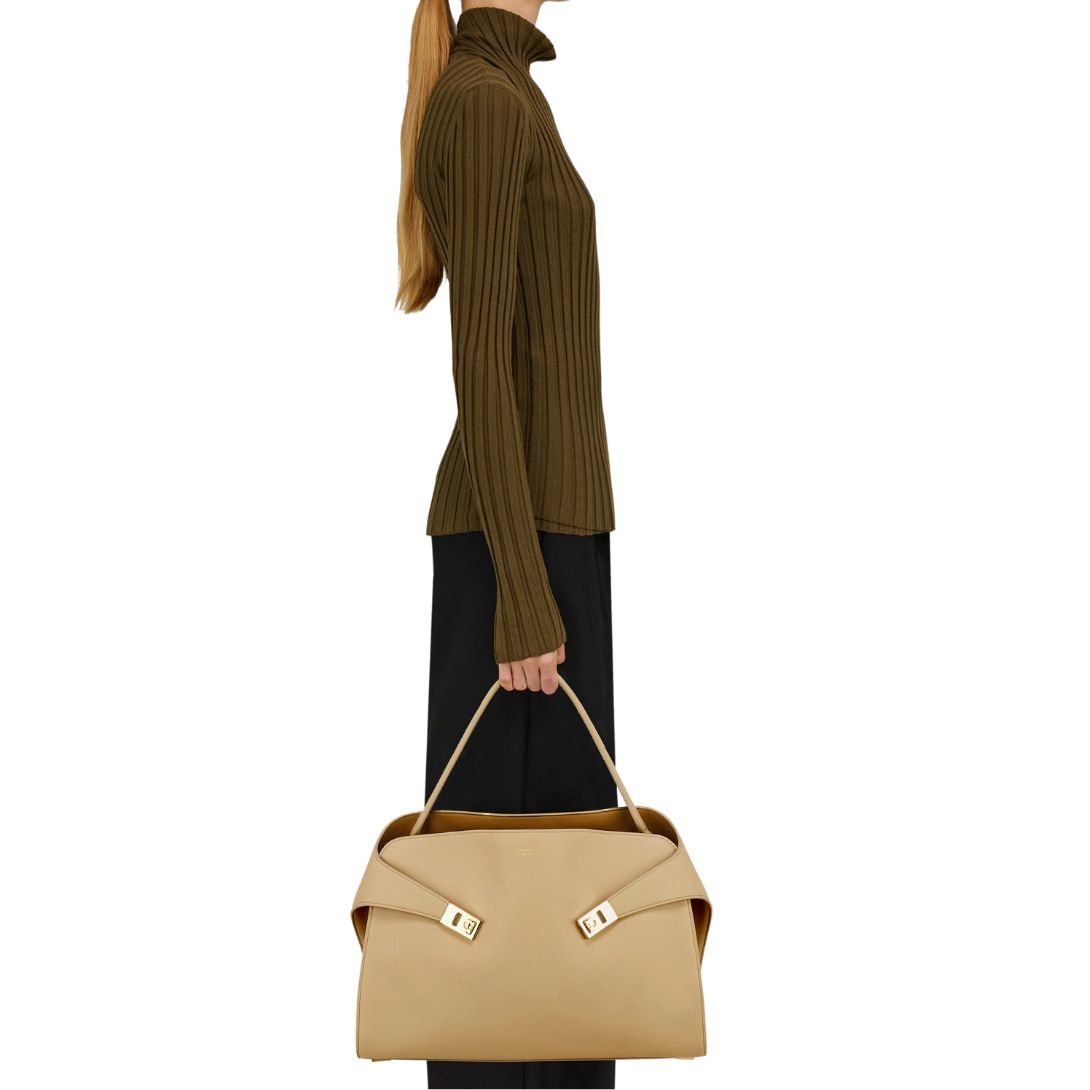 The single top handle gently softens the front quadrant, enhanced by gold-finish Gancini buckles that add a luxurious touch.