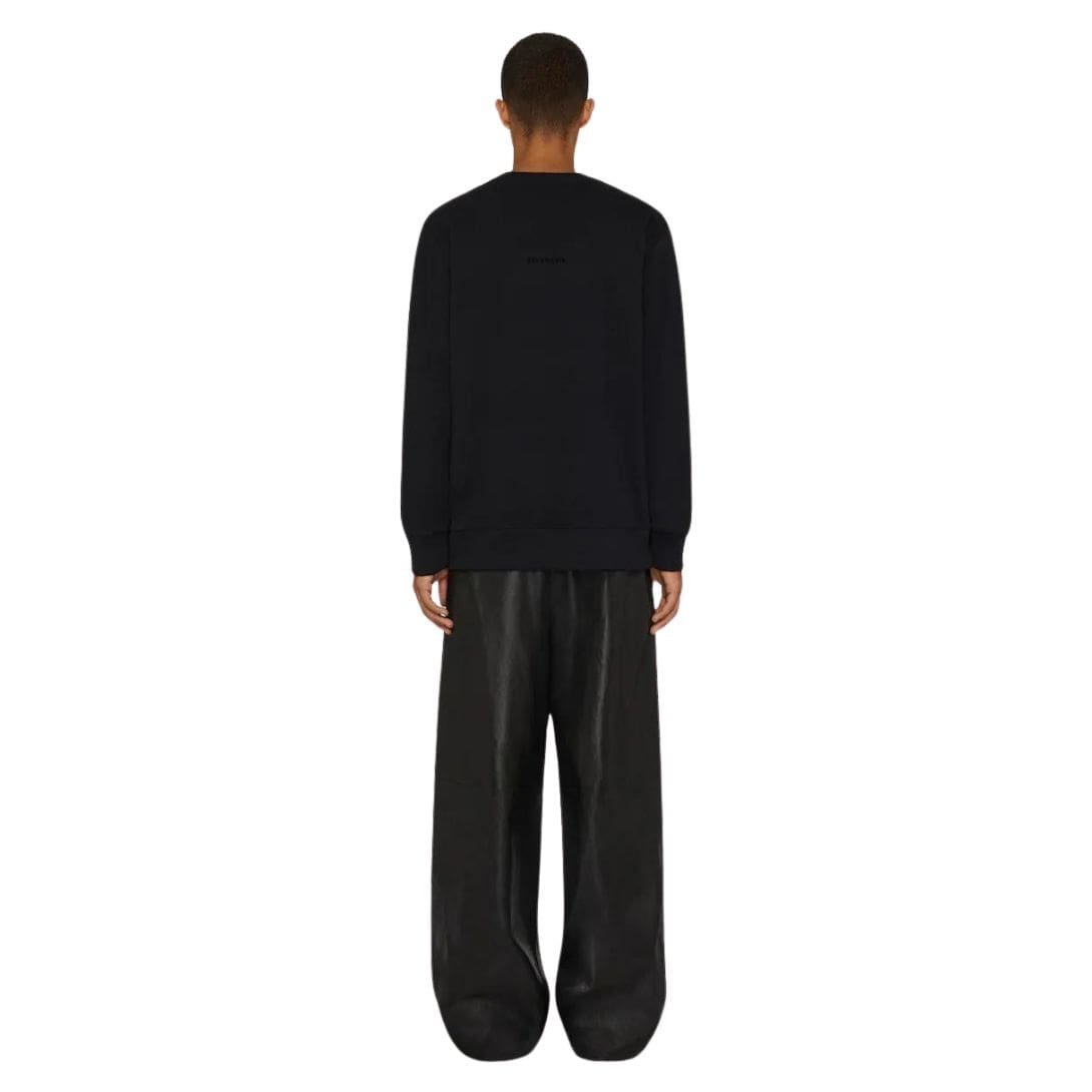 The sweatshirt’s crew neckline is finished with a ribbed trim, which maintains its shape and offers a snug fit. Ribbed cuffs and hem also contribute to the sweatshirt’s structured look while ensuring a comfortable fit that stays in place. The classic black color enhances its versatility, allowing it to be easily paired with various outfits, from jeans to tailored trousers.