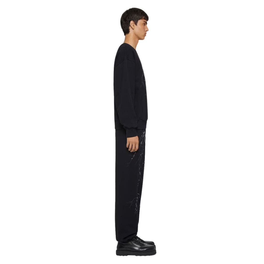 The sweatshirt’s color palette is typically understated yet elegant, often in classic tones such as black or grey, allowing the reflective artwork to stand out even more. It includes a crew neckline, which is a staple for both casual and streetwear-inspired outfits, and ribbed cuffs and hem that ensure a snug fit and help to maintain the garment’s shape over time.
