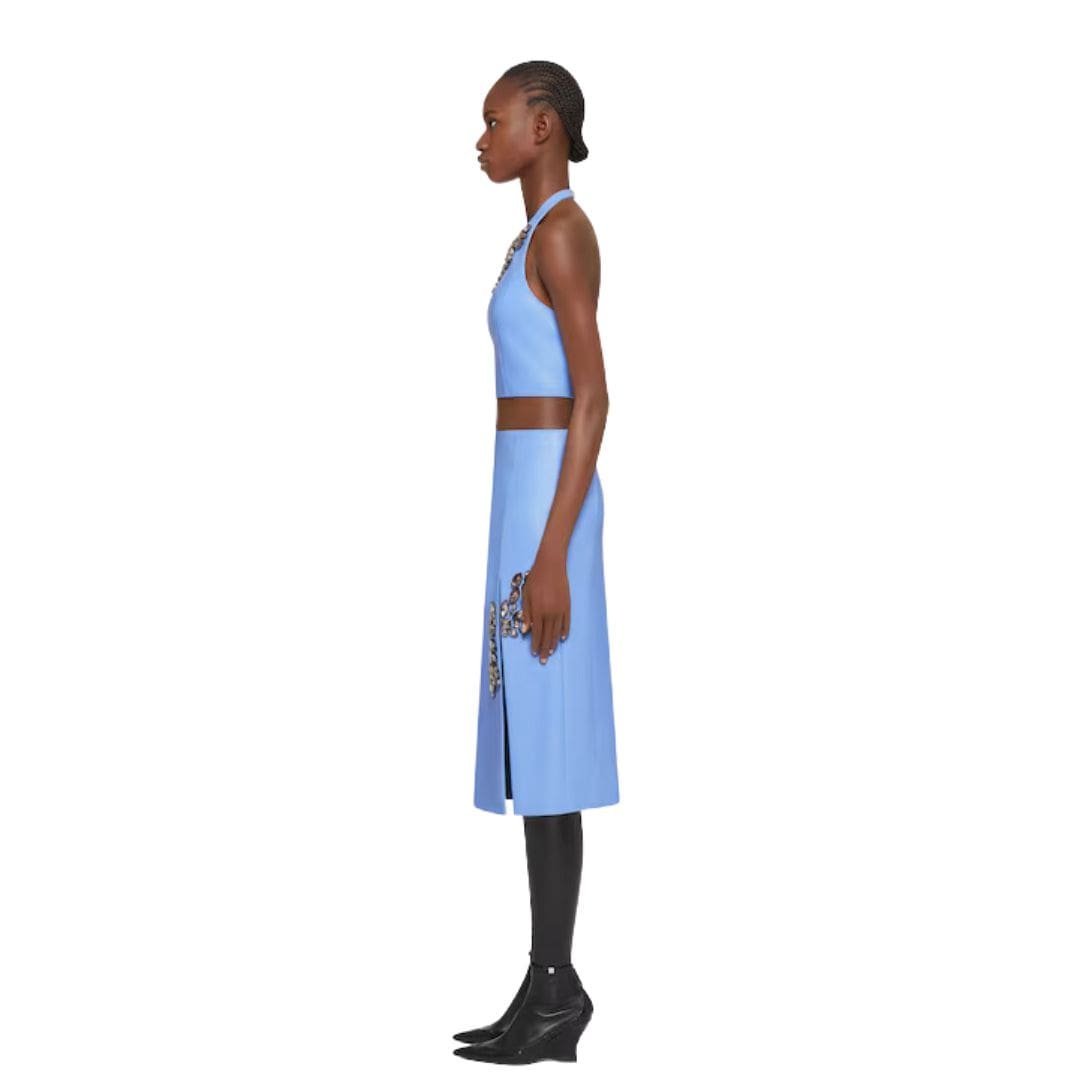 Introducing the Givenchy Cropped Top In Leather With Embroidered Stones is a striking fusion of edgy glamour and luxurious detailing, designed to captivate attention and elevate any ensemble. Crafted from supple leather, this top boasts a sleek and modern silhouette, featuring a cropped length that exudes contemporary flair. The standout feature of this piece is the intricate embroidery of stones, meticulously arranged to create a dazzling display of shimmer and texture. Each stone adds a touch of opulence and sophistication, transforming this top into a statement piece fit for the most glamorous occasions. Whether paired with high-waisted trousers for a chic evening look or layered under a tailored blazer for a fashion-forward twist, this Givenchy creation promises to command the spotlight with its impeccable craftsmanship and undeniable allure.