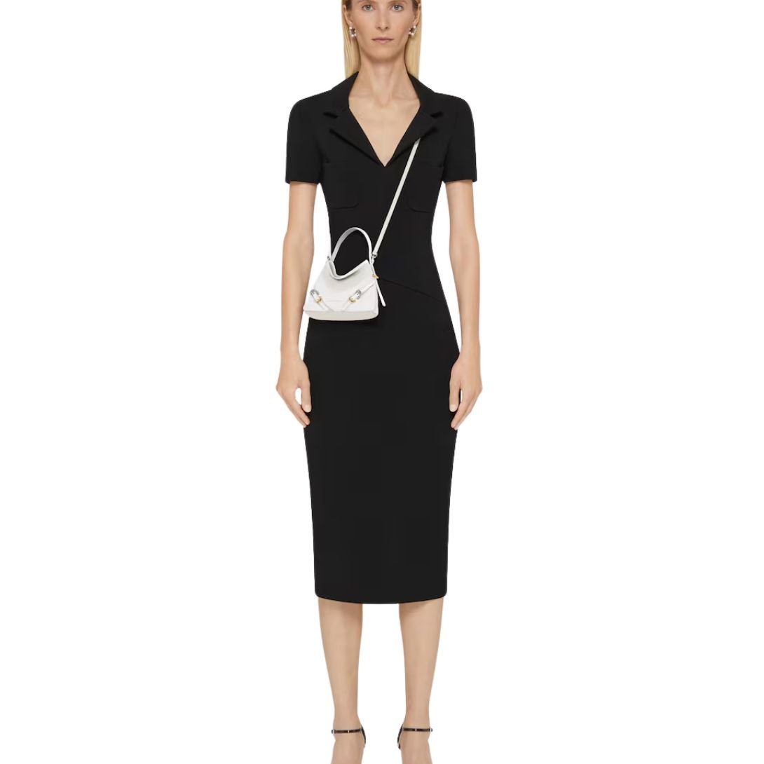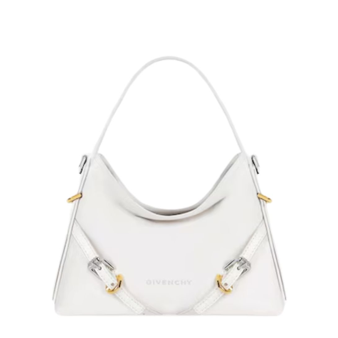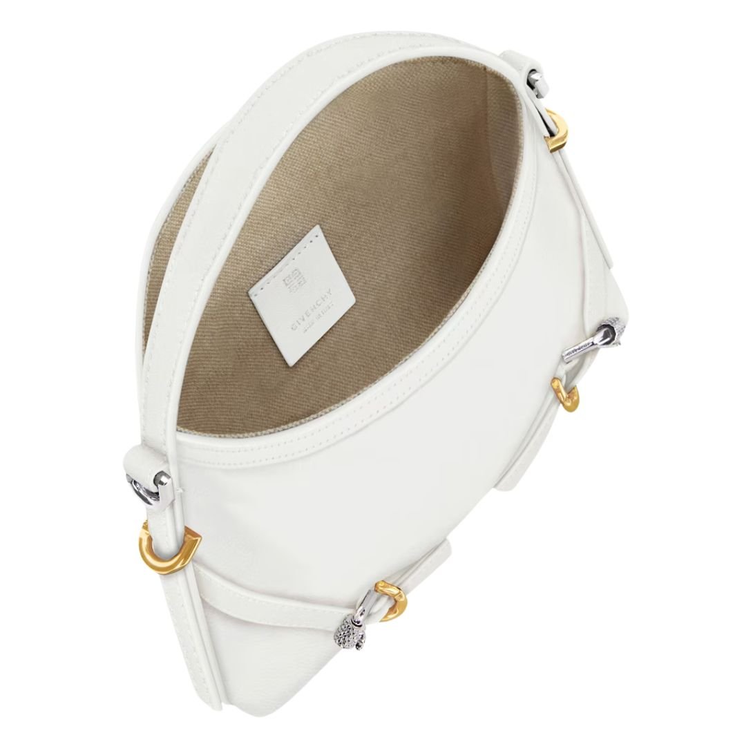 Featuring a short leather top handle and a thin, removable strap, the bag offers versatile styling options—carry it as a chic mini handbag or wear it crossbody for a hands-free statement. The GIVENCHY signature is embossed on the front, while engraved metal buckles add a refined touch of hardware, blending gold and silver finishes for a modern, mixed-metal look.