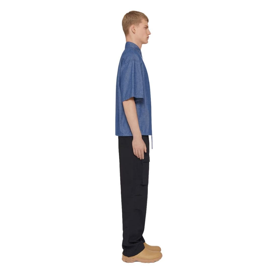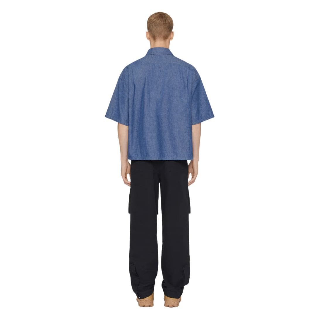 Designed with meticulous attention to detail, the overshirt features a relaxed yet tailored fit that flatters the silhouette. Its structure includes a classic spread collar, adding a touch of formality that makes it suitable for both casual and semi-formal occasions. The front of the shirt is adorned with a button-down closure, featuring high-quality buttons engraved with the Givenchy logo, underscoring the brand’s commitment to luxury and refinement. GIVENCHY OVERSHIRT IN DENIM CHAMBRAY