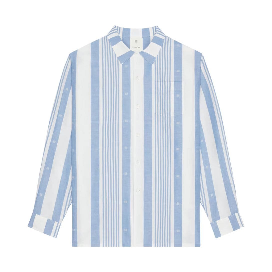 The Givenchy Shirt in Ozone Washed Denim Chambray is a sophisticated and contemporary piece that epitomizes modern casualwear. Crafted from high-quality chambray fabric, this shirt features a unique ozone-washed treatment that gives it a distinct, slightly faded appearance. This wash technique imparts a vintage charm while maintaining a sleek, polished look, making it versatile for both casual and semi-formal occasions.