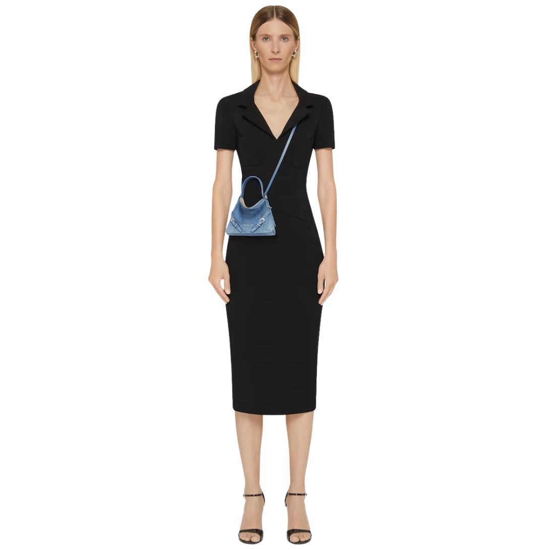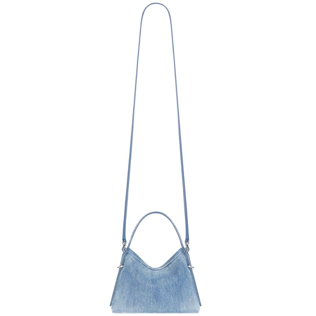 Infused with a street-chic edge, the Nano Voyou Bag from Givenchy’s coveted Voyou line is reimagined in soft washed denim for a fresh, contemporary feel. Compact in size yet full of attitude, this nano bag features a structured silhouette with a short denim handle and a removable leather strap for hands-free, crossbody styling.