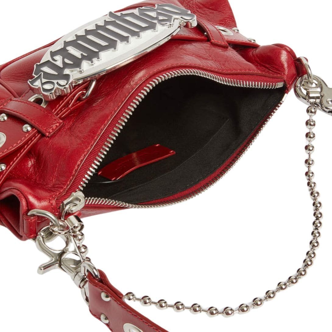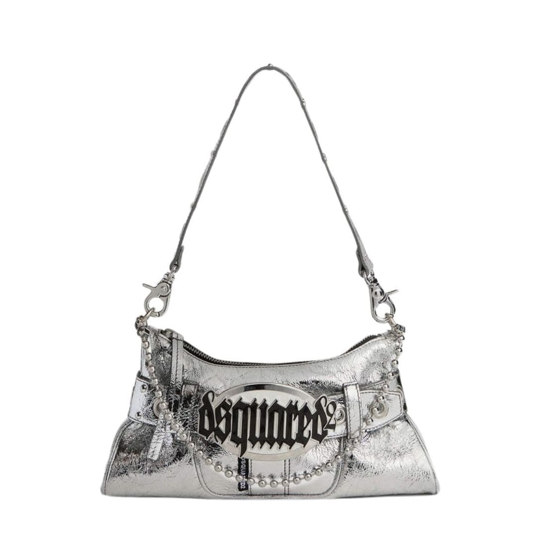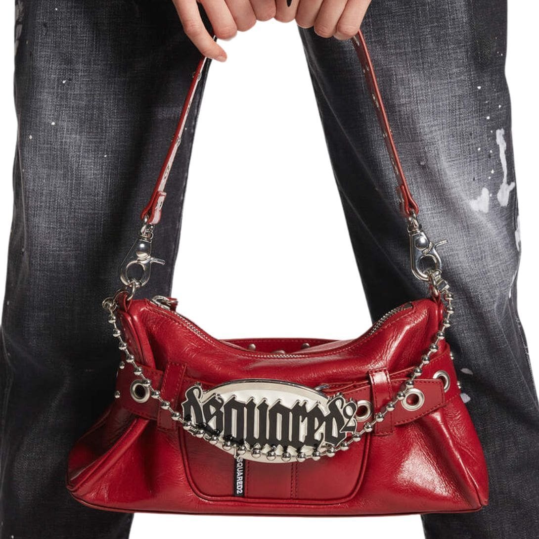 A defining characteristic of the Gothic DSquared2 Belt Bag is its distinctive embellishments. The front of the bag prominently displays gothic-inspired metal hardware, including the DSquared2 logo, which is often rendered in an ornate, intricate font that pays homage to medieval script. This gothic lettering adds a dramatic, edgy flair to the bag, setting it apart from more conventional designs.