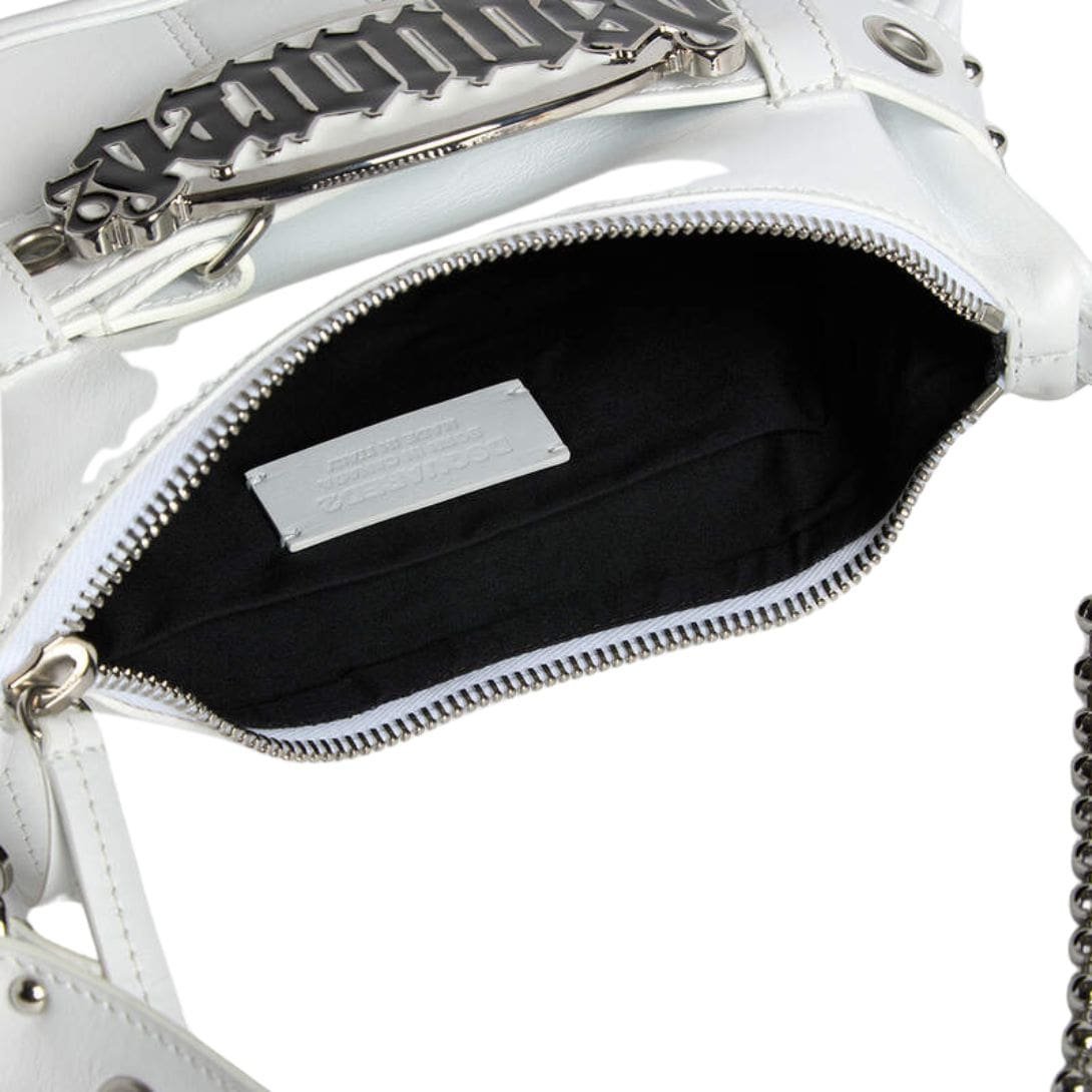 A defining characteristic of the Gothic DSquared2 Belt Bag is its distinctive embellishments. The front of the bag prominently displays gothic-inspired metal hardware, including the DSquared2 logo, which is often rendered in an ornate, intricate font that pays homage to medieval script. This gothic lettering adds a dramatic, edgy flair to the bag, setting it apart from more conventional designs.