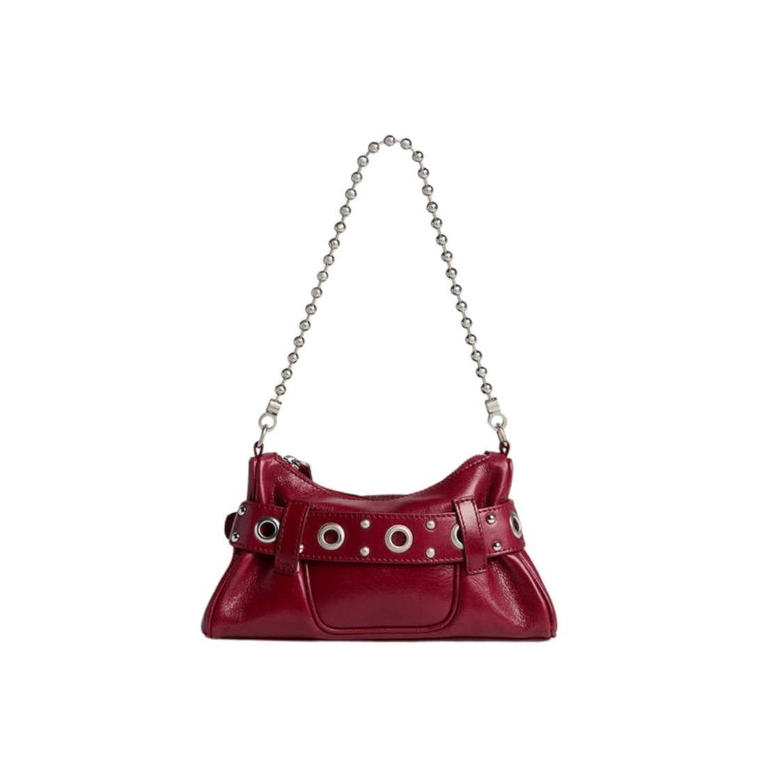 The design of the clutch draws inspiration from Gothic architecture, with intricate details reminiscent of ornate cathedral motifs. Its structure is sleek and streamlined, featuring clean lines that are juxtaposed with dramatic elements such as metallic studs, chains, and bold hardware accents. The result is a visually captivating piece that commands attention and invites admiration.