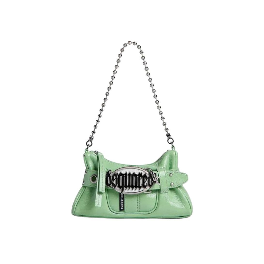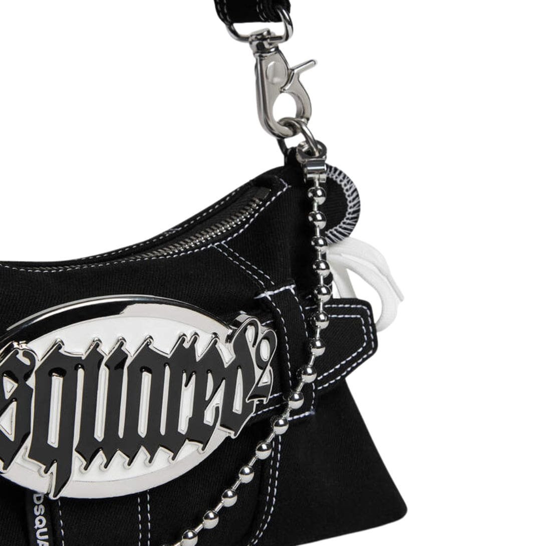 The bag’s design is heavily influenced by Gothic elements, which are evident in its intricate detailing. Embellishments such as metal studs, rivets, and chains add a layer of toughness and sophistication, enhancing the bag’s overall appeal. The front flap of the bag features a bold, embroidered Dsquared2 logo in a gothic font, making a statement that is unmistakably high-fashion and brand-conscious.