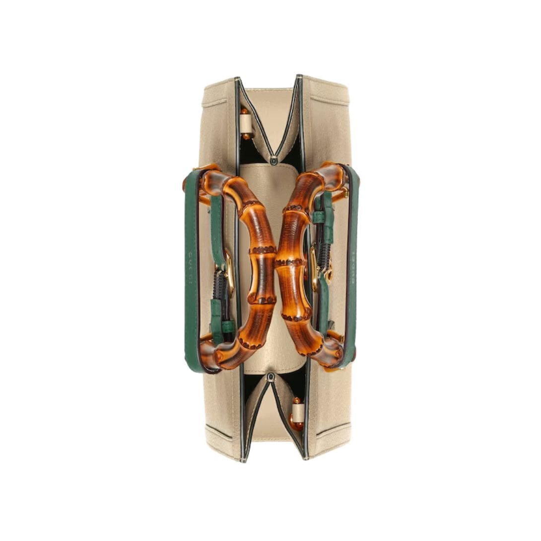 In addition to its bamboo handles, the bag is equipped with removable leather belts, an innovative update that blends form and function. These belts can be used to cinch the bag’s sides, offering a customizable look and added security for the contents inside. The belts, available in contrasting colors, add a playful and modern twist to the classic design.