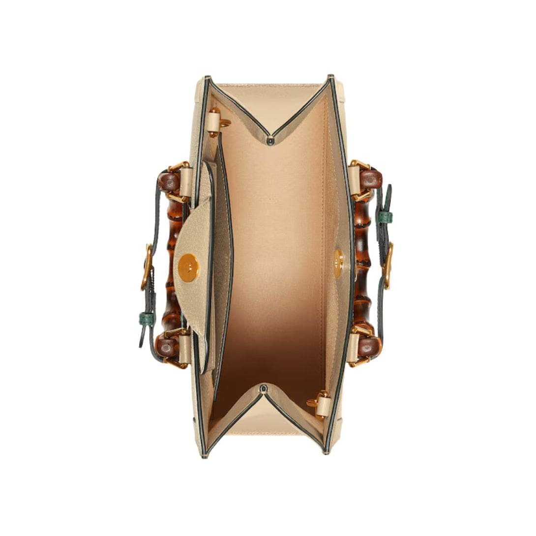 One of the standout features of the Gucci Diana Medium Tote Bag is its bamboo handles. These handles are a signature element of Gucci’s design language, paying homage to the brand’s storied past while adding a unique and recognizable touch. The bamboo is meticulously treated and crafted, offering a comfortable grip and a distinctive aesthetic appeal. GUCCI DIANA MEDIUM TOTE BAG