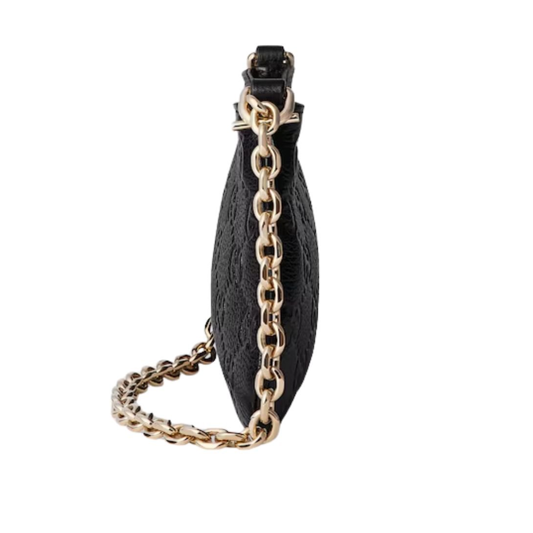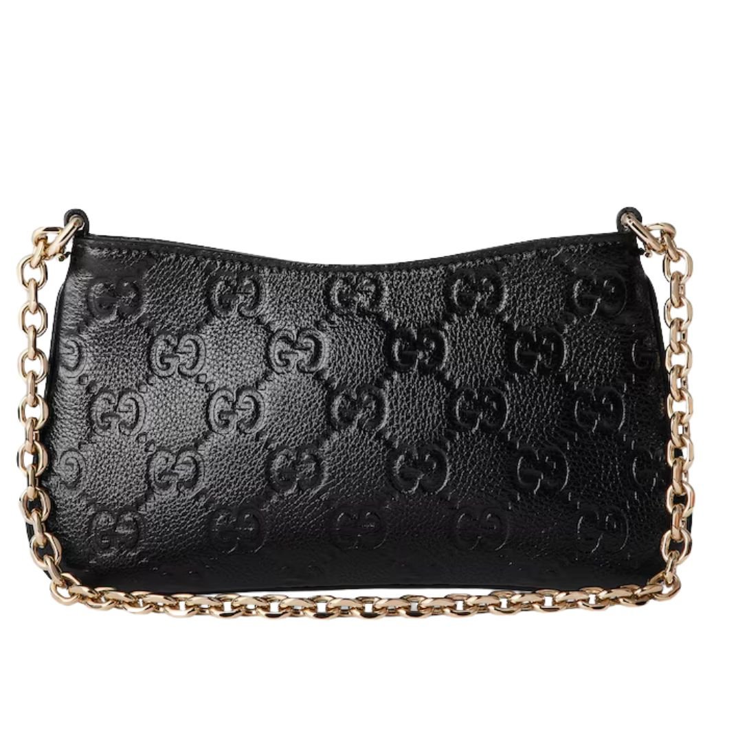 Expertly crafted from black GG grainy leather, the bag showcases Gucci’s dedication to quality and timeless style. It features a cotton linen lining for a refined interior finish. The design is enhanced by the combination of two versatile strap options: a detachable chain shoulder strap and an adjustable leather strap, offering multiple ways to wear.