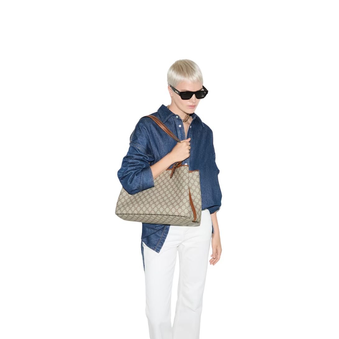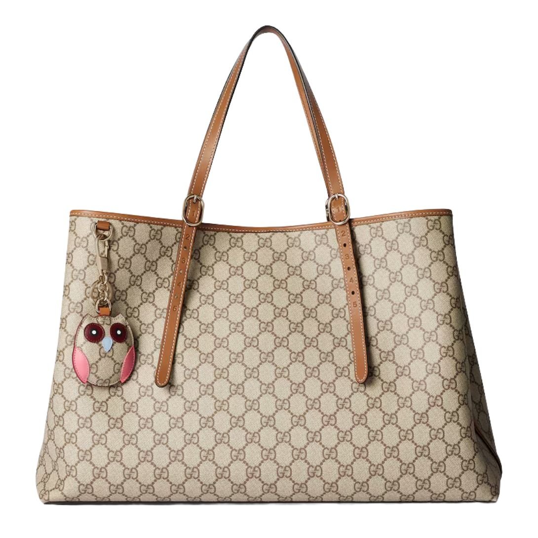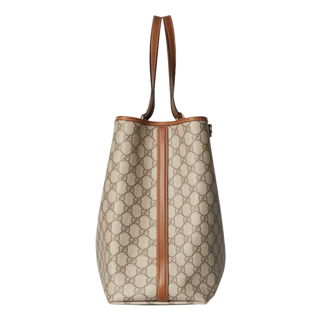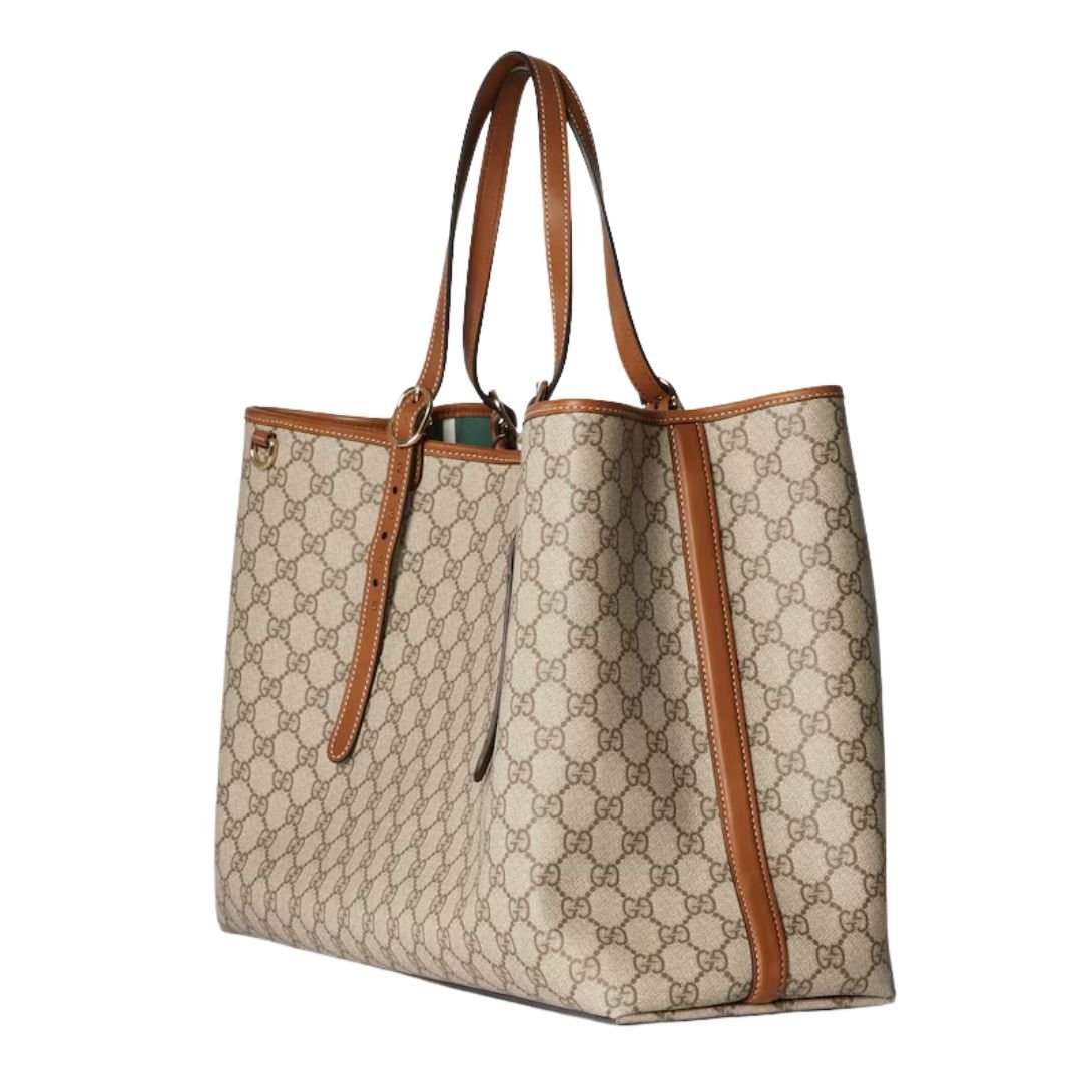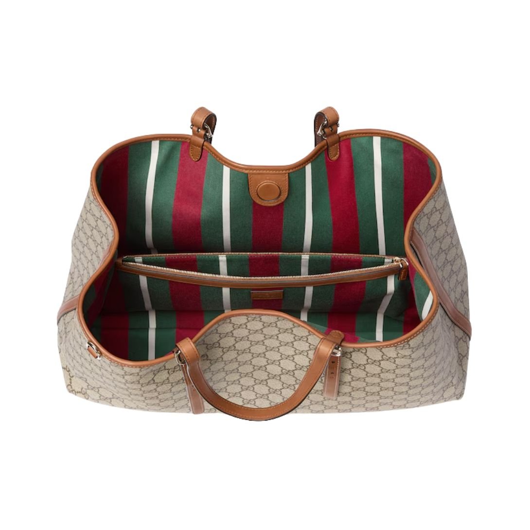 Crafted from beige and dark brown new GG Monogram coated fabric, the tote is accented with brown leather trim featuring contrast stitching. The interior showcases Gucci’s iconic green and red Web cotton lining, enhancing the bag’s classic aesthetic.