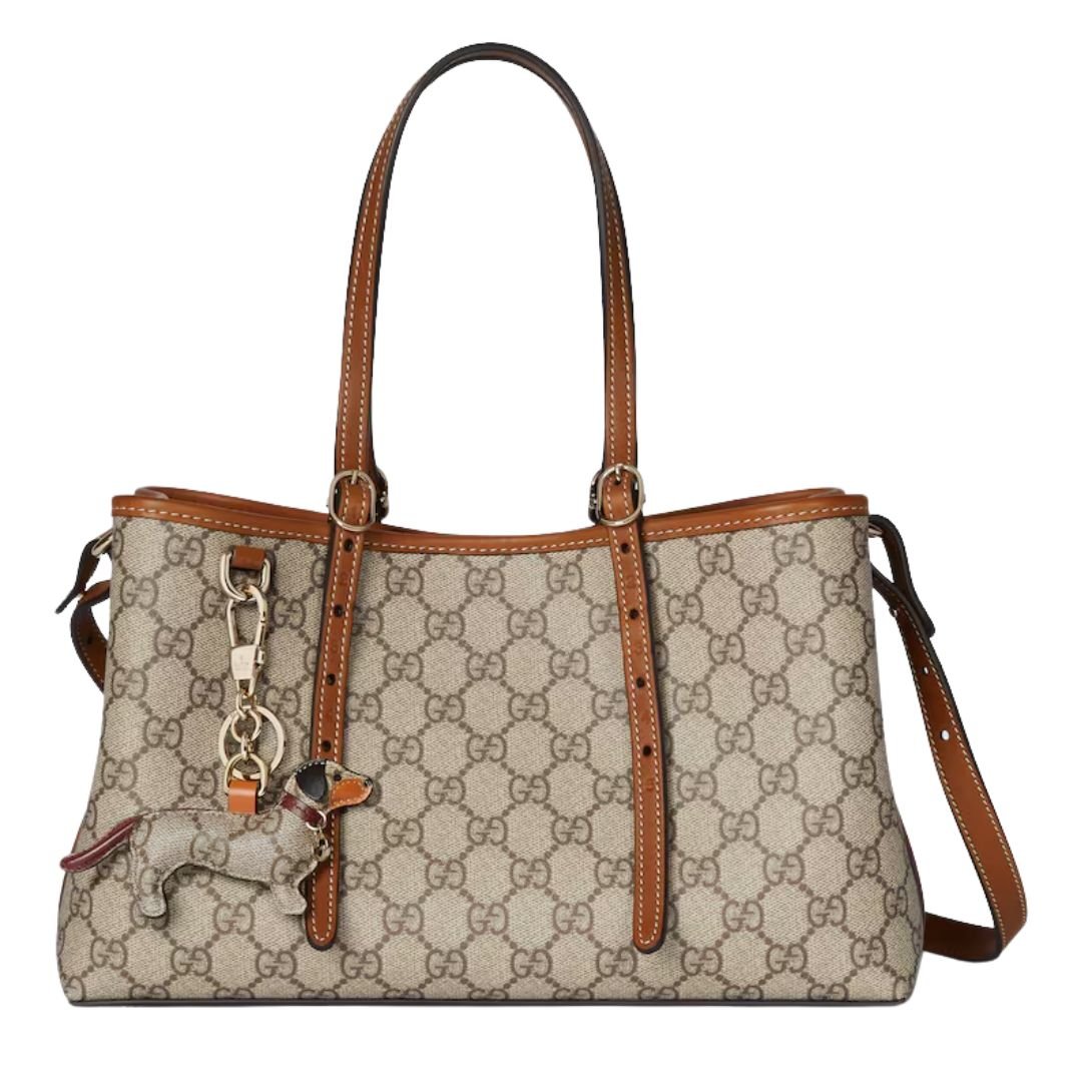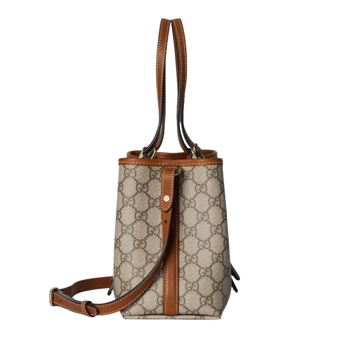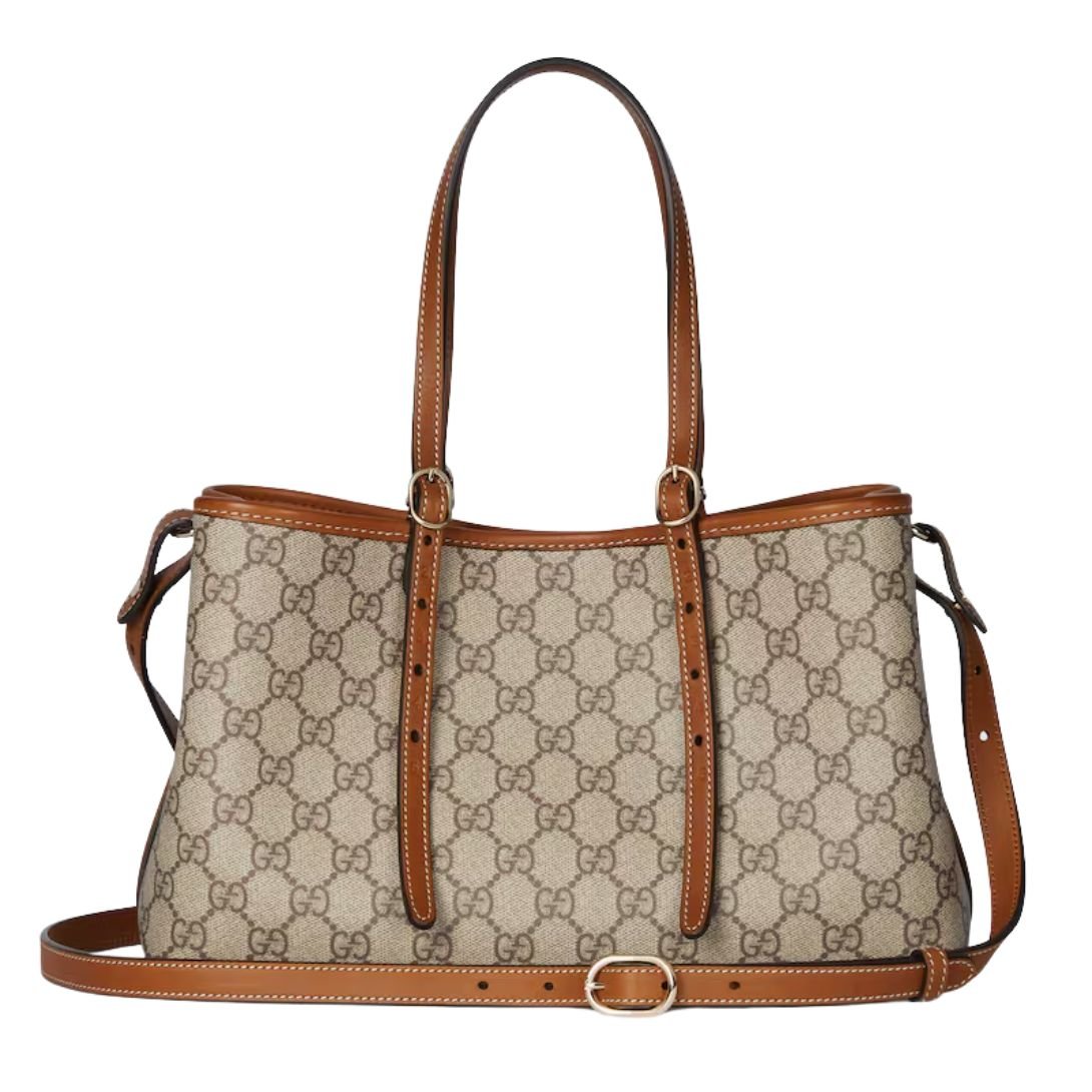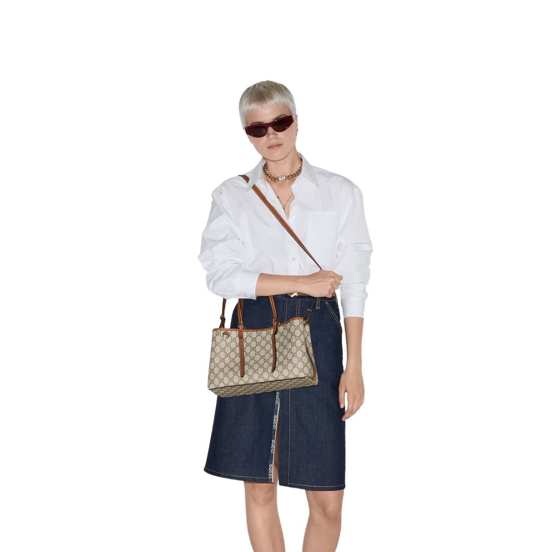 Crafted from beige and dark brown GG Monogram coated fabric, the tote boasts brown leather trim with contrast stitching, adding depth and texture to the design. Light gold-toned hardware enhances the bag’s luxurious appeal, while the iconic green and red Web cotton lining inside ensures a signature Gucci look.