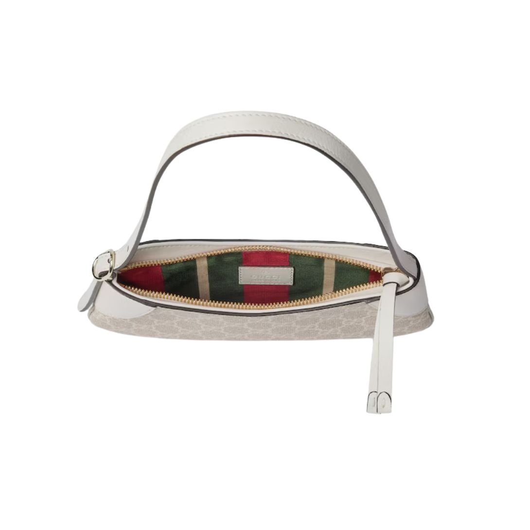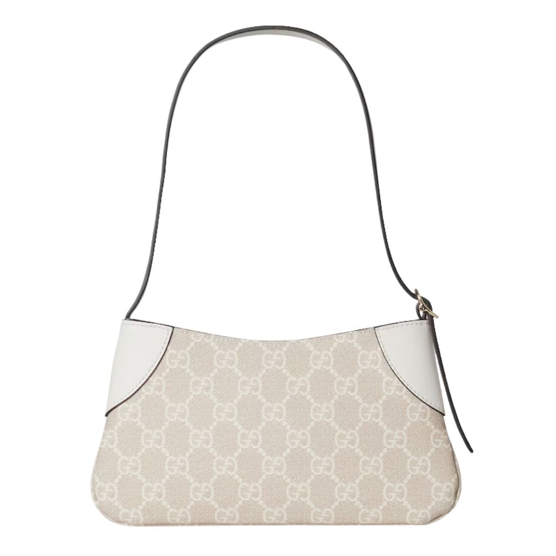 This beige and white GG Monogram shoulder bag is a testament to enduring style, offering both beauty and functionality for the modern wardrobe.