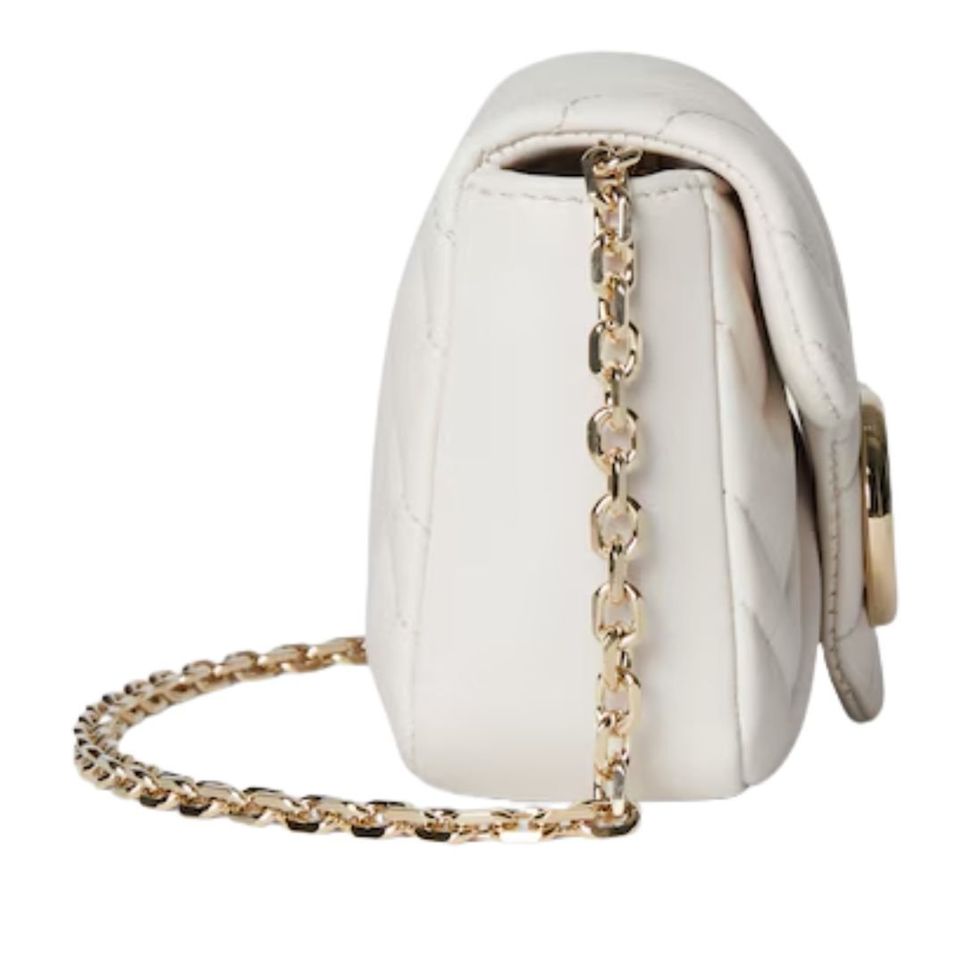 Crafted from white matelassé chevron lambskin leather, this mini bag offers a supple texture that exudes luxury. The silver-toned hardware adds a sleek contrast to the soft leather, enhancing the bag’s sophisticated appeal.