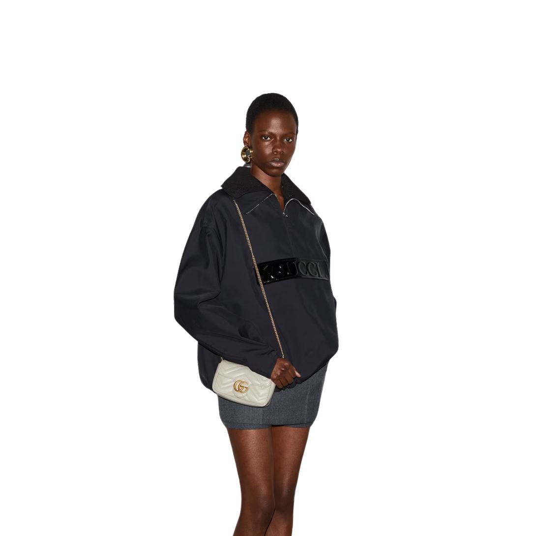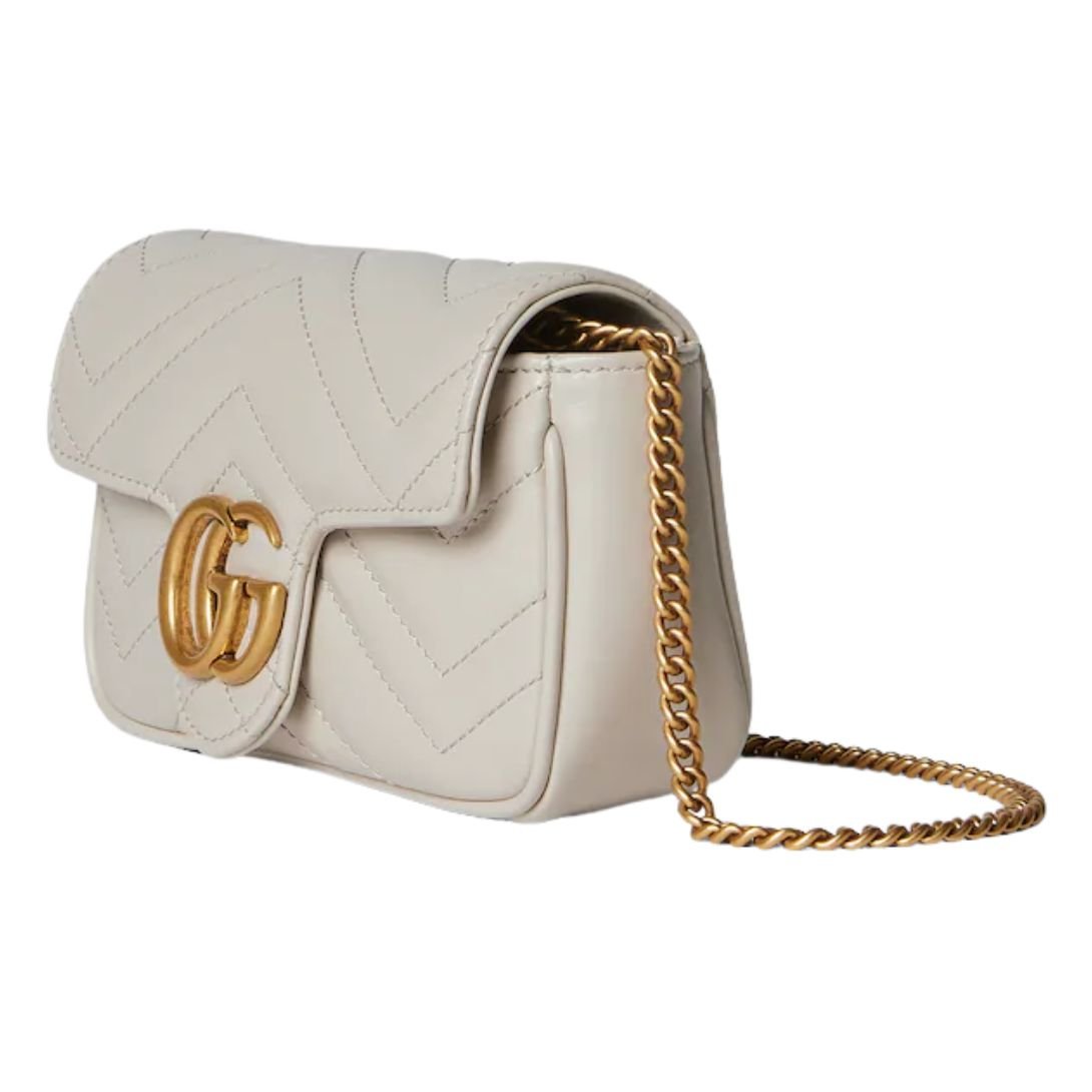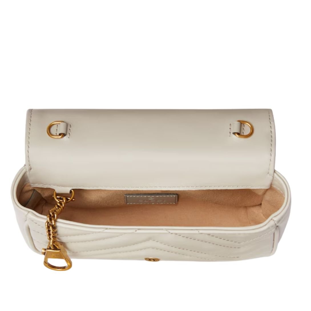 Crafted from light grey matelassé chevron leather, the GG Marmont mini bag exudes understated elegance and modern sophistication. Featuring the Double G logo in antique gold-toned hardware, this mini bag is a refined addition to any collection. The included key ring adds versatility by allowing you to attach the bag to a separate accessory for added convenience.