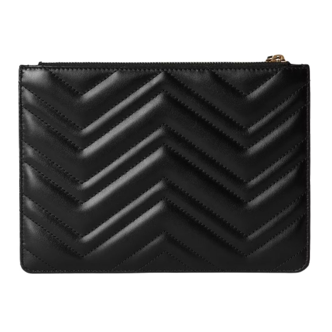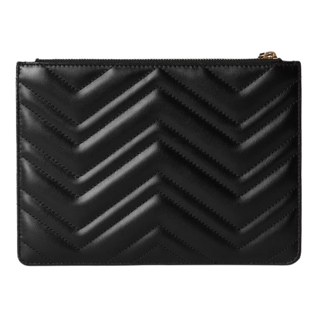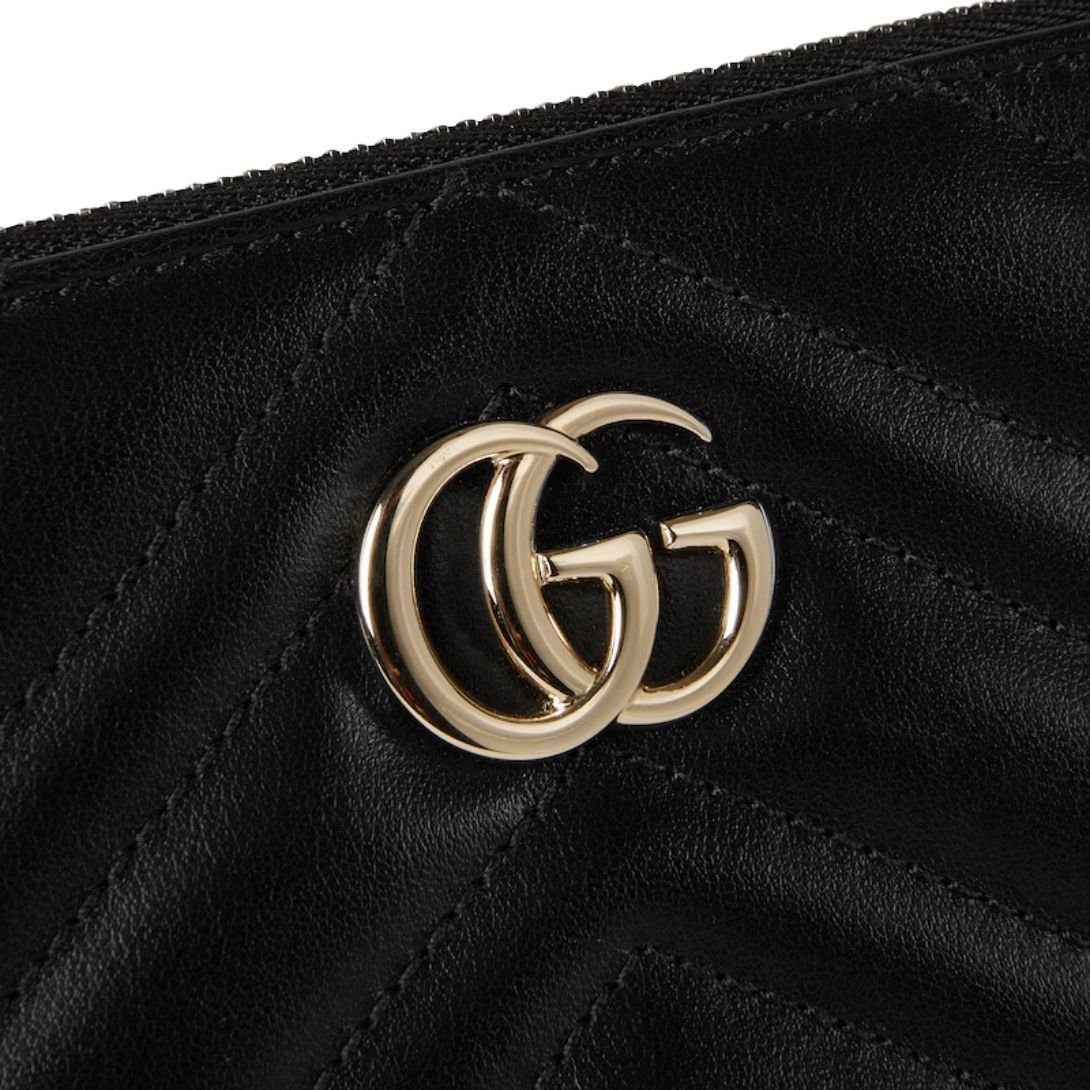 The GG Marmont collection is defined by its iconic Double G hardware, a modern interpretation of a Gucci archival belt buckle from the 1970s. This small pouch, crafted from classic black matelassé leather with a chevron design, showcases the signature logo detail in a light gold tone, adding a luxurious touch to its simple yet sophisticated silhouette.
