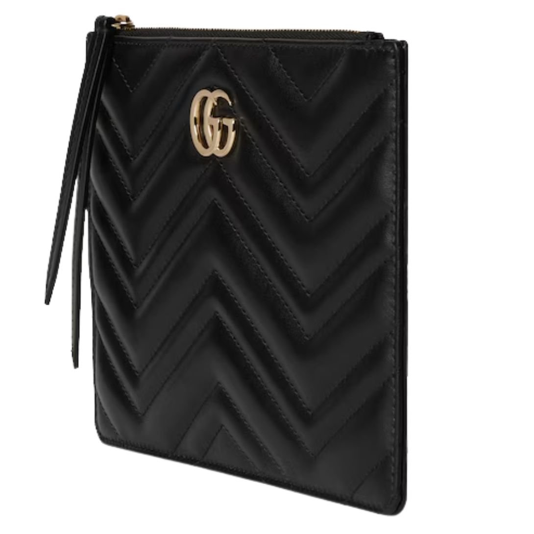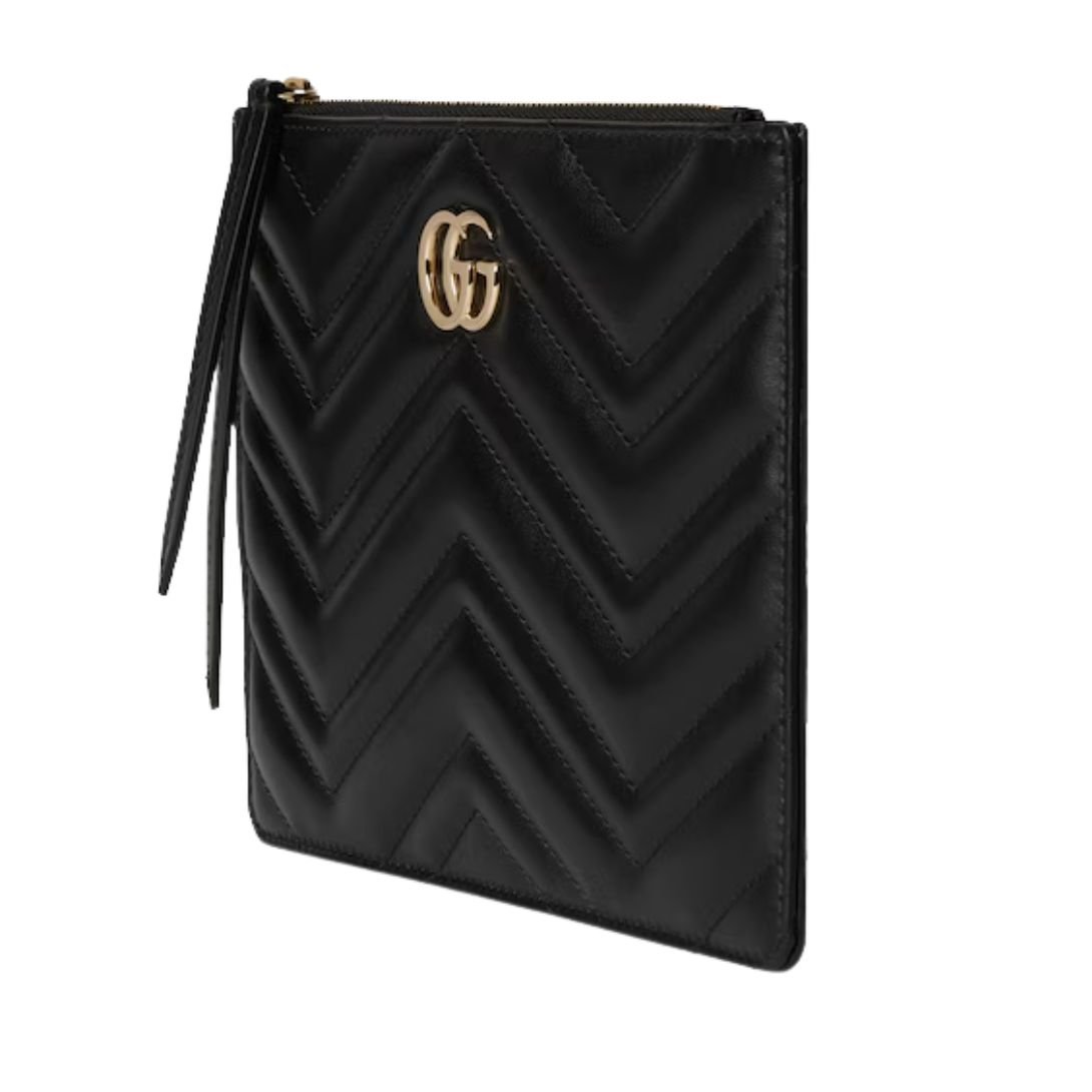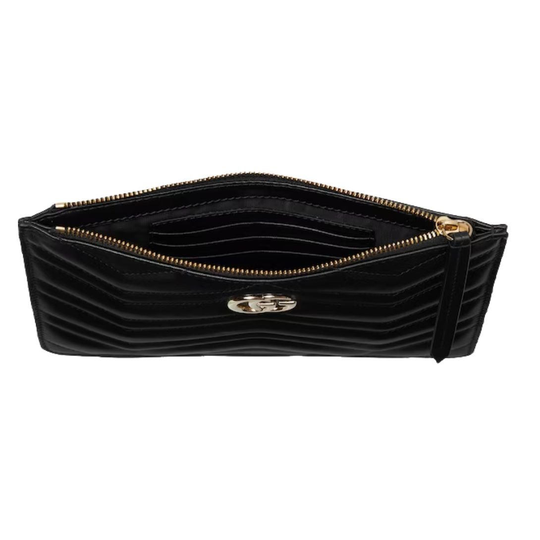 The GG Marmont collection is defined by its iconic Double G hardware, a modern interpretation of a Gucci archival belt buckle from the 1970s. This small pouch, crafted from classic black matelassé leather with a chevron design, showcases the signature logo detail in a light gold tone, adding a luxurious touch to its simple yet sophisticated silhouette.