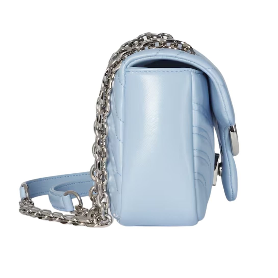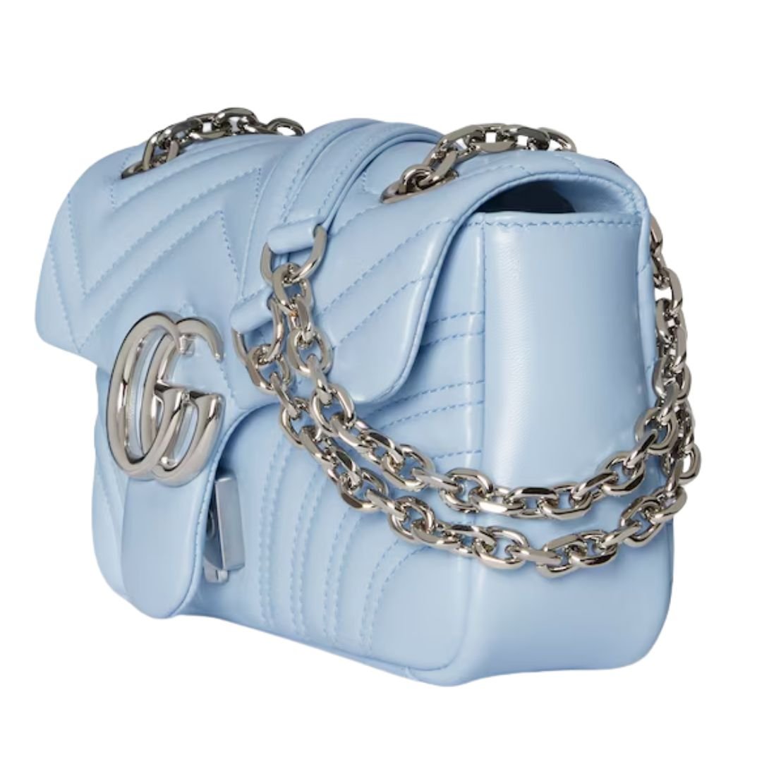 The GG Marmont collection, a signature range from Gucci, is synonymous with luxury and timeless design. Known for its iconic Double G hardware, faceted chain strap, and supple leather construction, this light blue version offers both elegance and versatility for the modern fashion enthusiast.