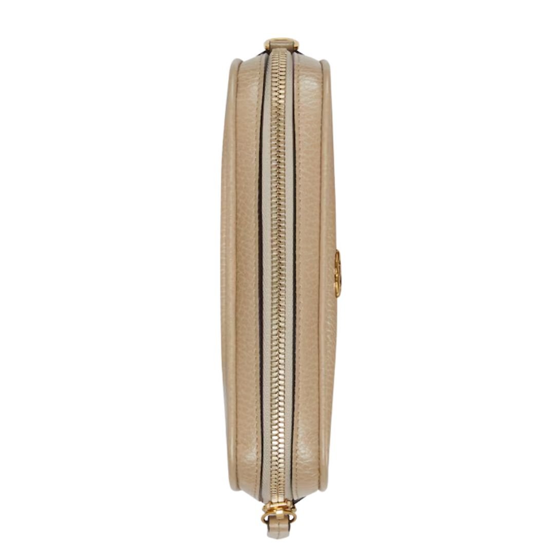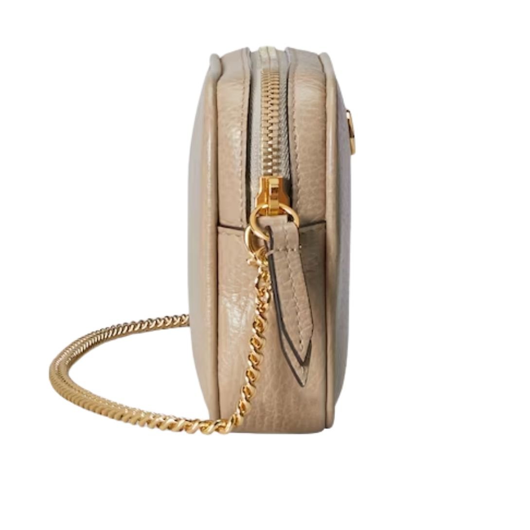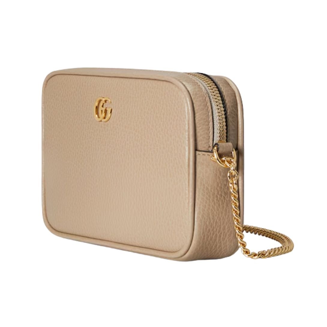 A symbol of timeless elegance, the GG Marmont collection is defined by the iconic Double G gold-toned hardware — a modern reinterpretation of a historic Gucci emblem. This beige leather camera bag effortlessly combines heritage with contemporary design.