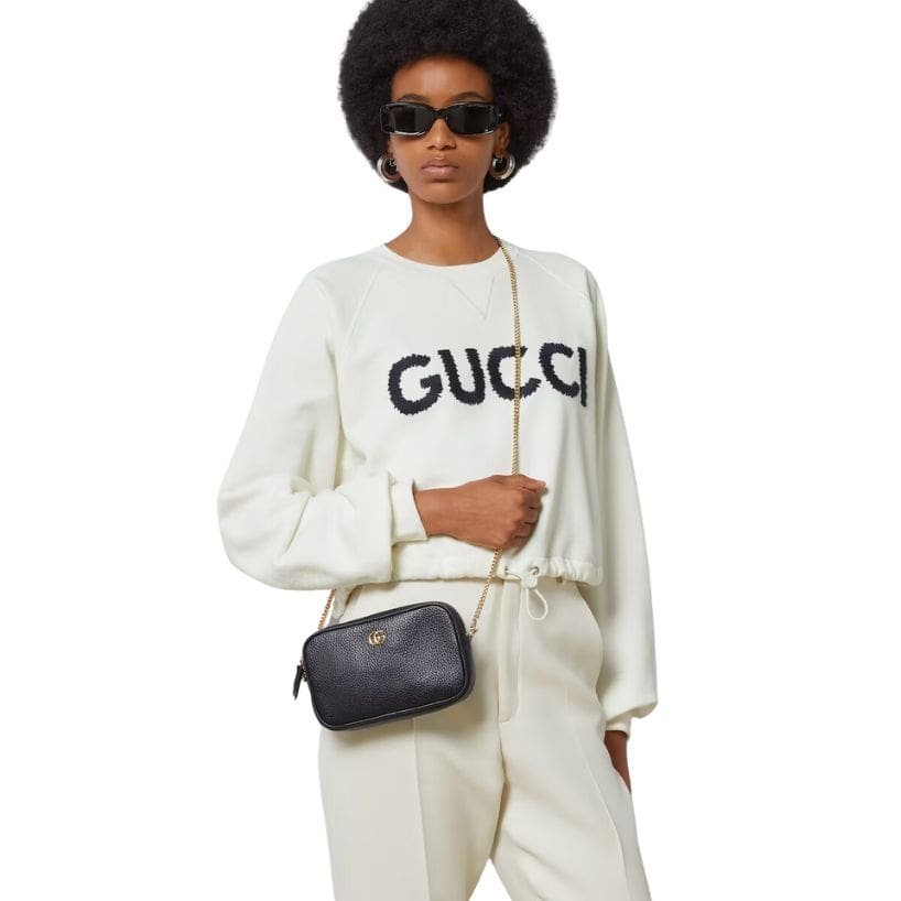 A defining feature of the GG Marmont Super Mini is the antique gold-toned hardware, particularly the iconic GG logo on the front flap. This emblematic detail is a nod to Gucci’s rich heritage and adds a touch of vintage glamour to the design. The chain shoulder strap, also in antique gold, complements the hardware and allows for versatile styling options. It can be worn as a crossbody, over the shoulder, or even used as a clutch by tucking the chain inside.