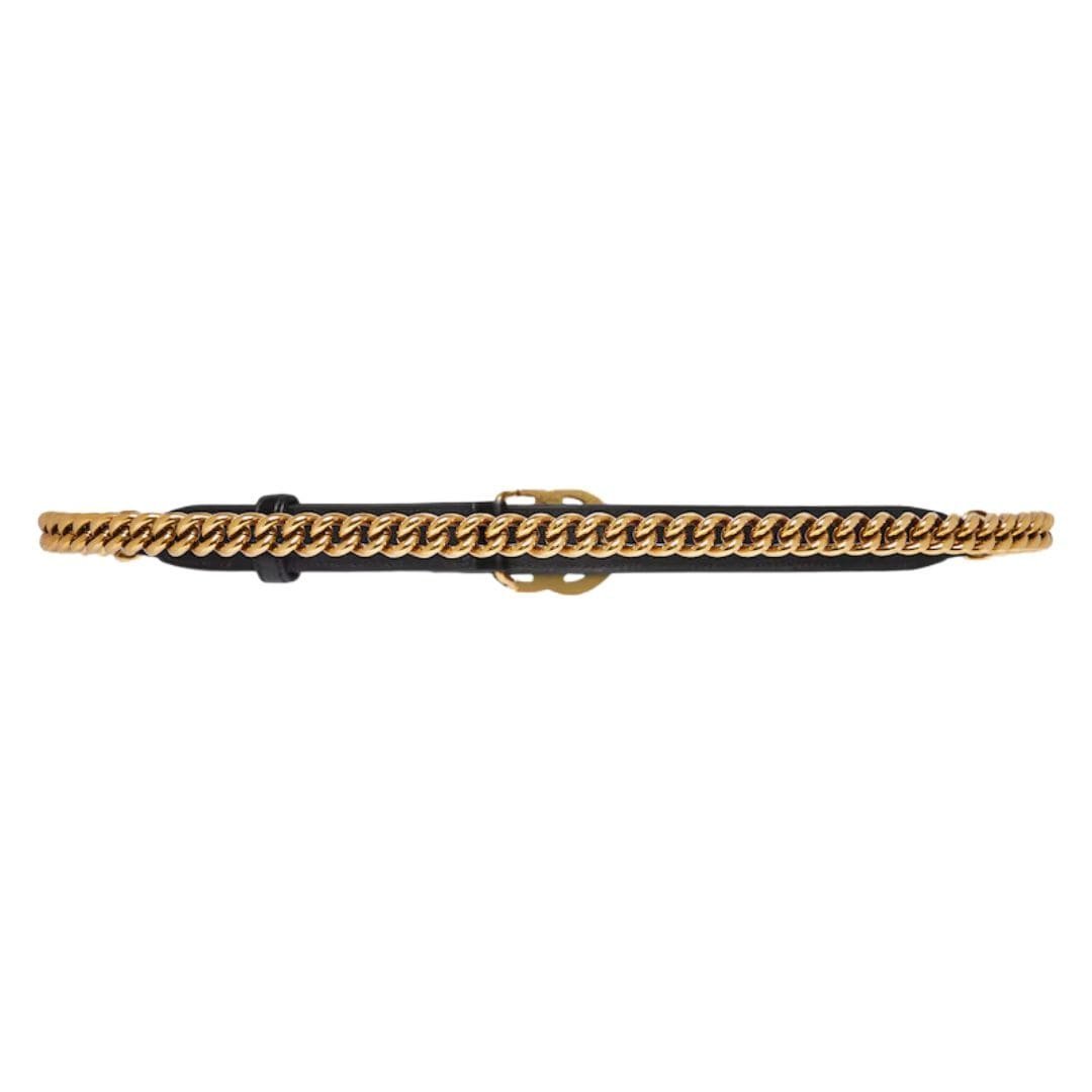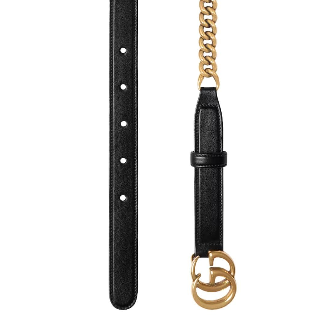 Gucci GG Marmont Thin Chain Belt Crafted with meticulous attention to detail, this belt exudes timeless elegance. The fusion of black leather and a gold-toned metal chain seamlessly blends tradition with modernity, creating a piece that transcends eras. The iconic Double G motif, embellished with gold-toned hardware, adds a touch of luxury and prestige.