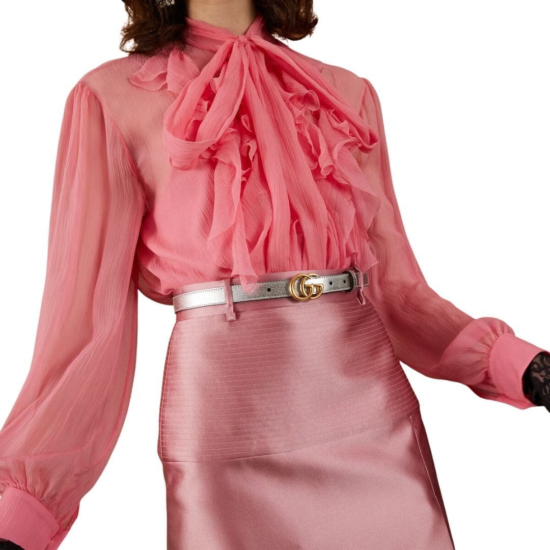 In a testament to our enduring commitment to timeless elegance and innovation, a Gucci GG Marmont Wide belt that echoes the iconic GG Marmont handbag, adorned with the signature Double G buckle. Drawing inspiration from a buckle unearthed from the ’70s archives, the gold-toned hardware undergoes a transformative process each season, reimagined in new iterations that play with the concept of timelessness.
