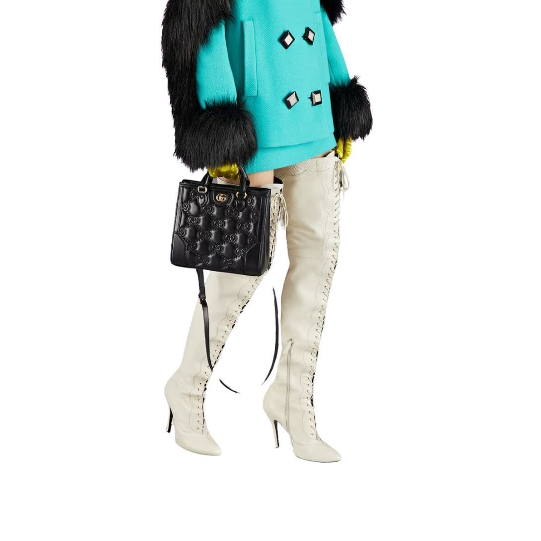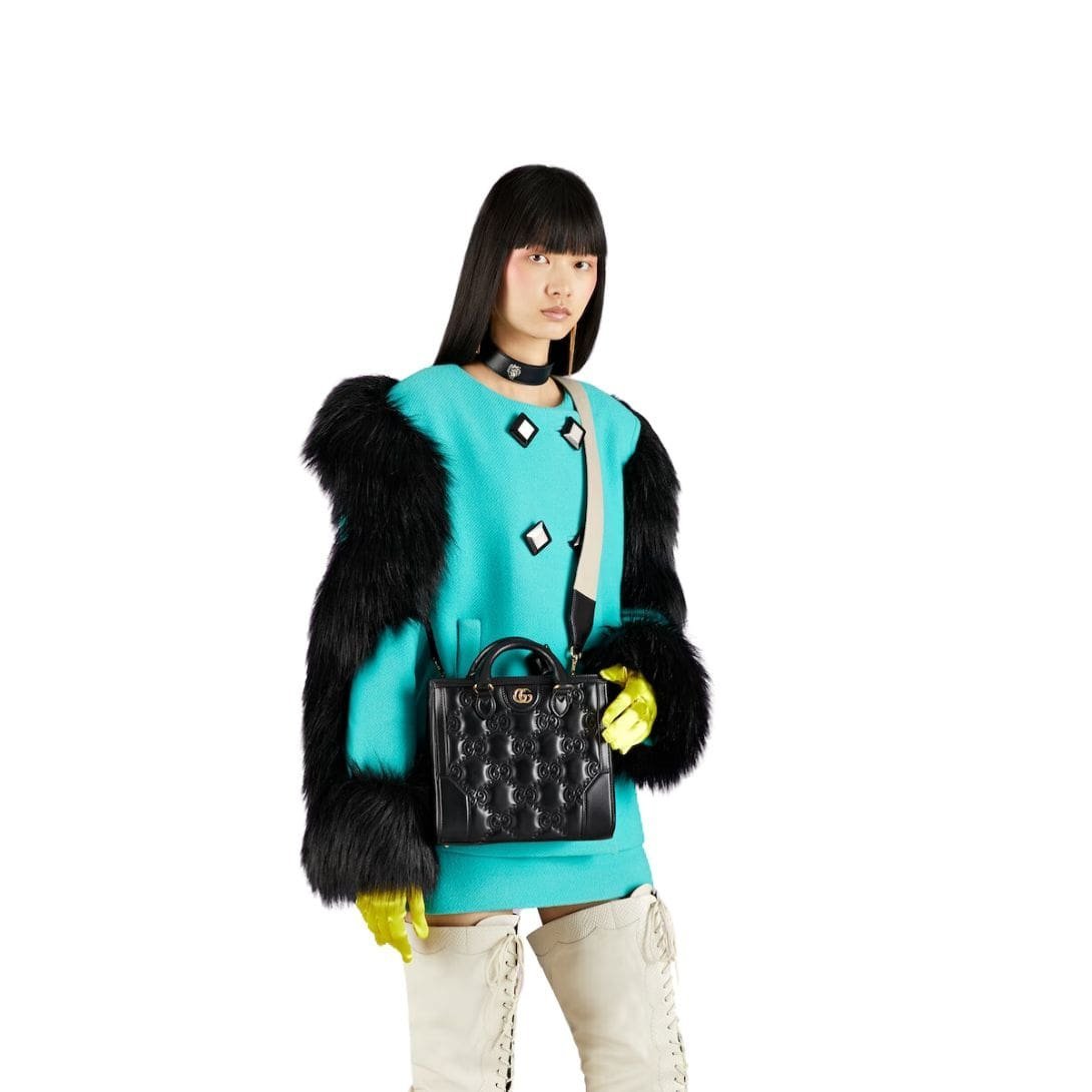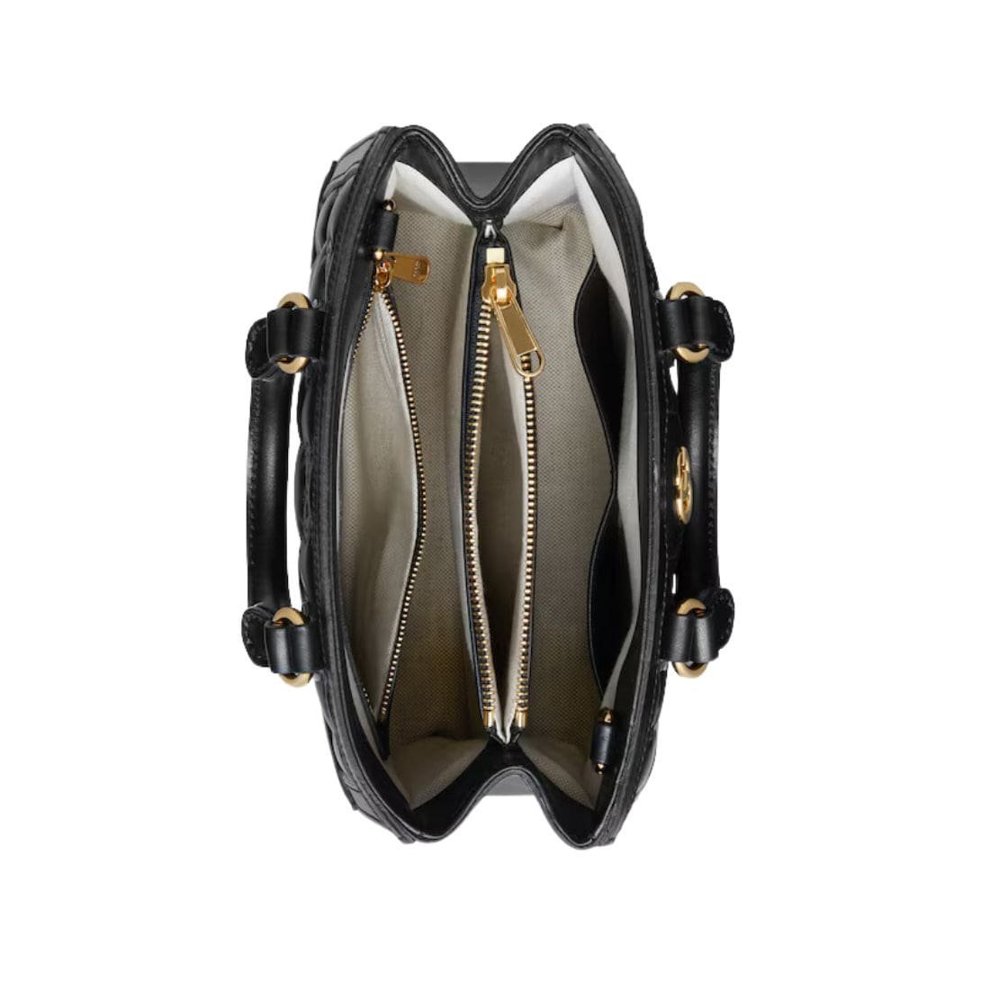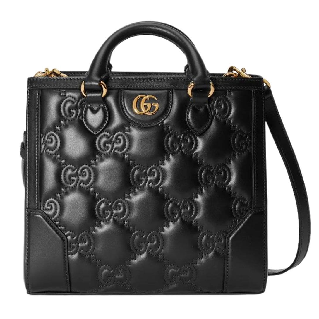 Measuring at a compact size, the mini top handle bag strikes the perfect balance between functionality and style. It is designed to be both versatile and convenient, easily fitting essentials such as a phone, wallet, and small cosmetics. The top handle is elegantly structured, allowing for a sophisticated carry option, while the detachable shoulder strap provides versatility, enabling the bag to be worn crossbody or over the shoulder for added convenience.  GUCCI GG MATELASSE MINI TOP HANDLE BAG