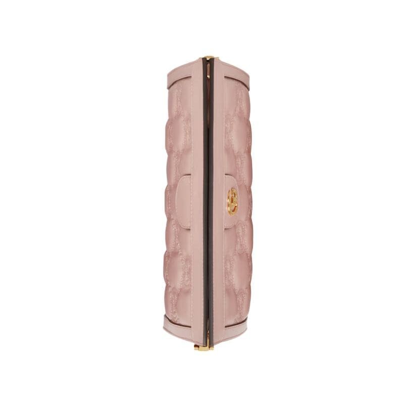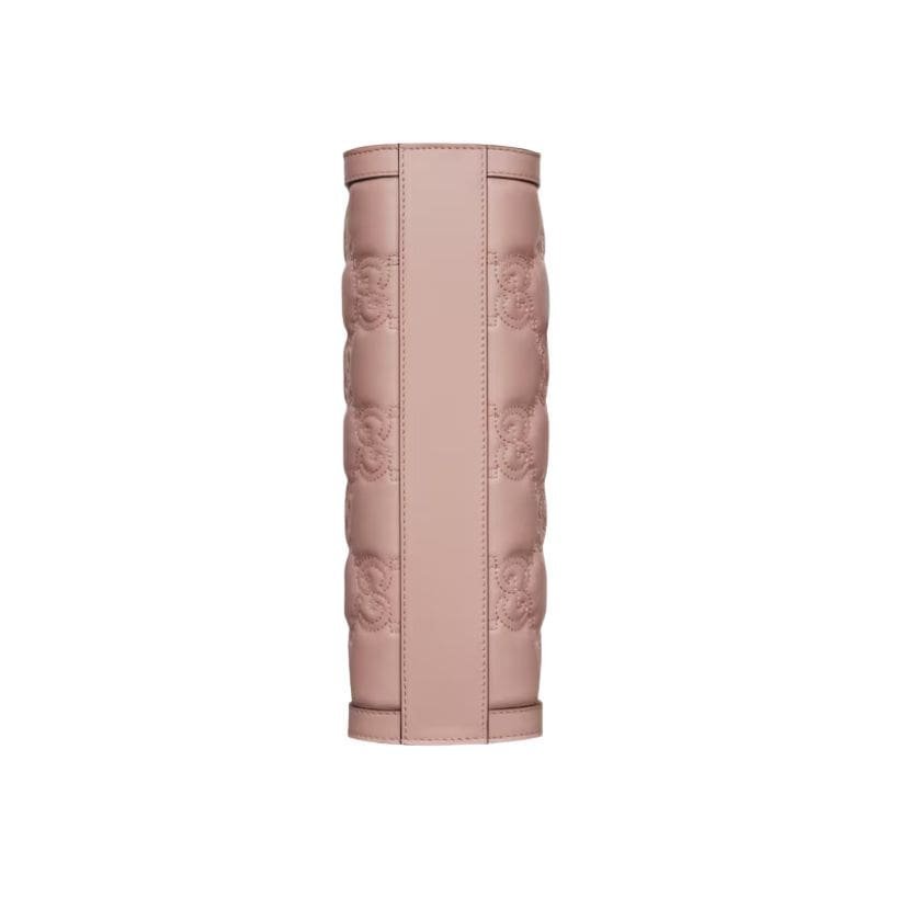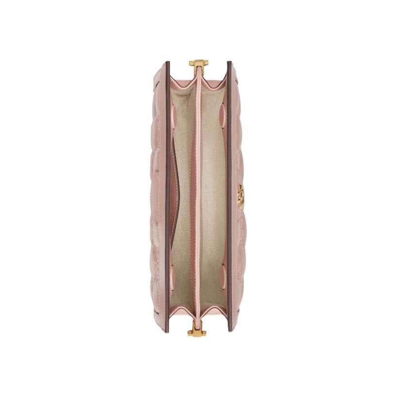 The interior of the GG Matelassé Small Shoulder Bag is thoughtfully designed to offer practicality alongside luxury. Lined with a soft fabric, it includes a main compartment and a slip pocket, perfect for organizing small items. The top zip closure ensures security and ease of access, while the exterior features a subtly embossed GG logo on the front flap, underscoring the brand’s signature style. GUCCI GG MATELASSE SMALL BAG