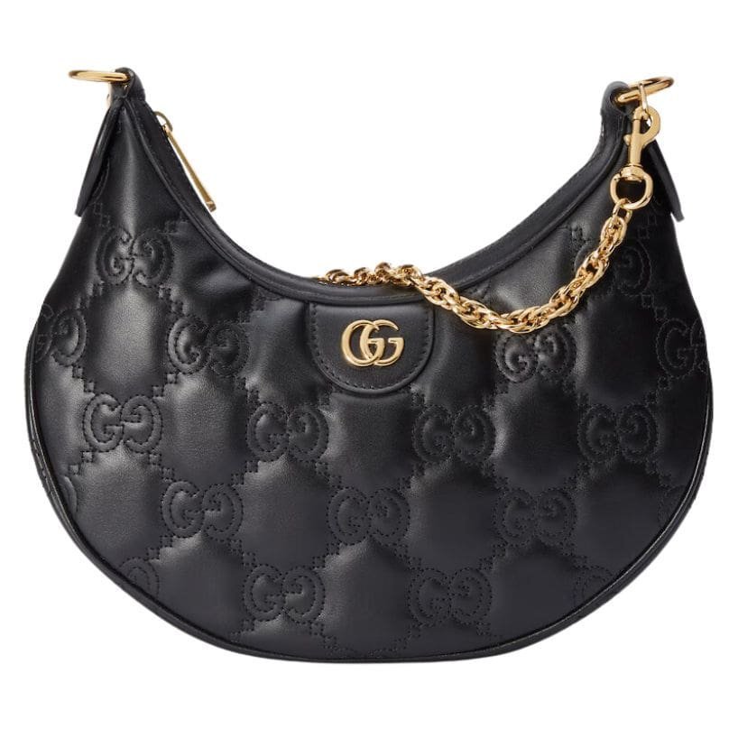 Measuring a compact yet versatile size, this small shoulder bag is designed for effortless day-to-night transitions. Its structure is sleek and streamlined, providing ample space for essentials without overwhelming the silhouette. The bag is complemented by a delicate gold-tone chain strap, which adds a hint of opulence and allows for versatile wear, whether draped casually over the shoulder or worn crossbody for a more contemporary look. The interior of the GG Matelassé Small Shoulder Bag is thoughtfully designed to offer practicality alongside luxury. Lined with a soft fabric, it includes a main compartment and a slip pocket, perfect for organizing small items. The top zip closure ensures security and ease of access, while the exterior features a subtly embossed GG logo on the front flap, underscoring the brand’s signature style.  GUCCI GG MATELASSE SMALL SHOULDER BAG