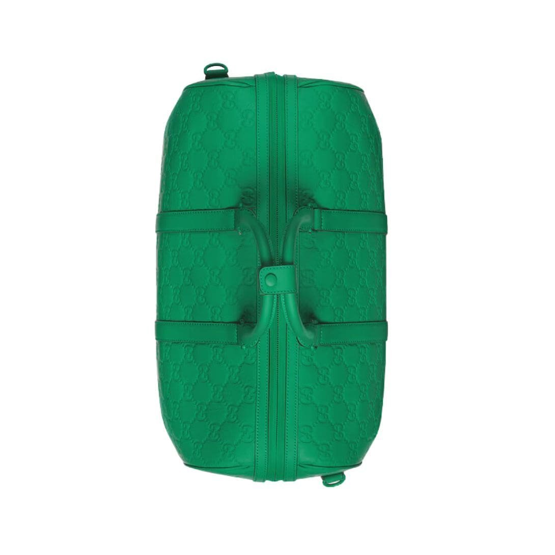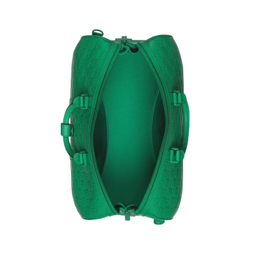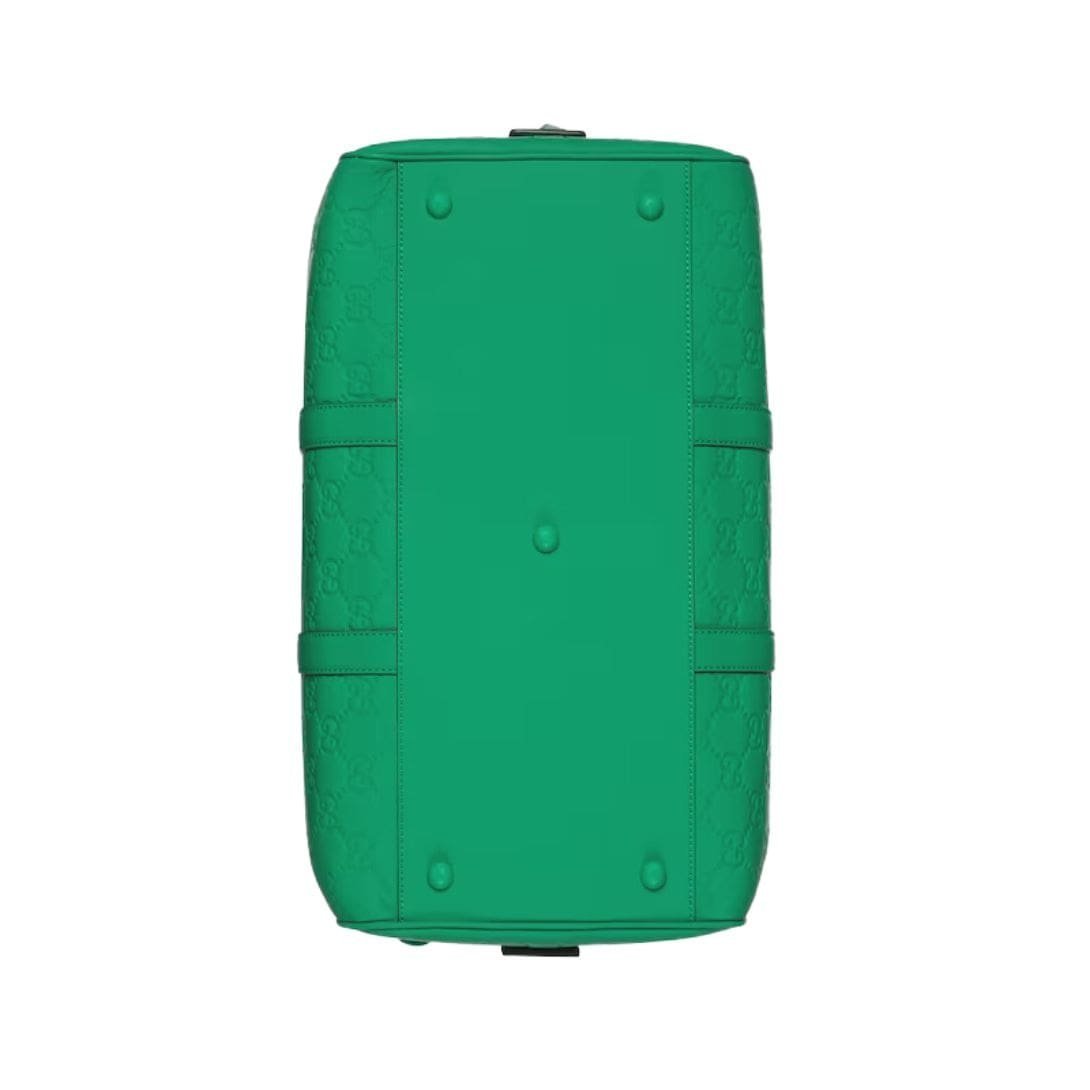 Inside, the bag features additional pockets, including a zip pocket and slip pockets, to help you stay organized. The meticulous attention to detail is evident in the fine stitching and the high-quality hardware, which includes the iconic double G logo in antique gold-tone metal. GUCCI GG RUBBER EFFECT MEDIUM DUFFLE BAG GREEN LETAHER