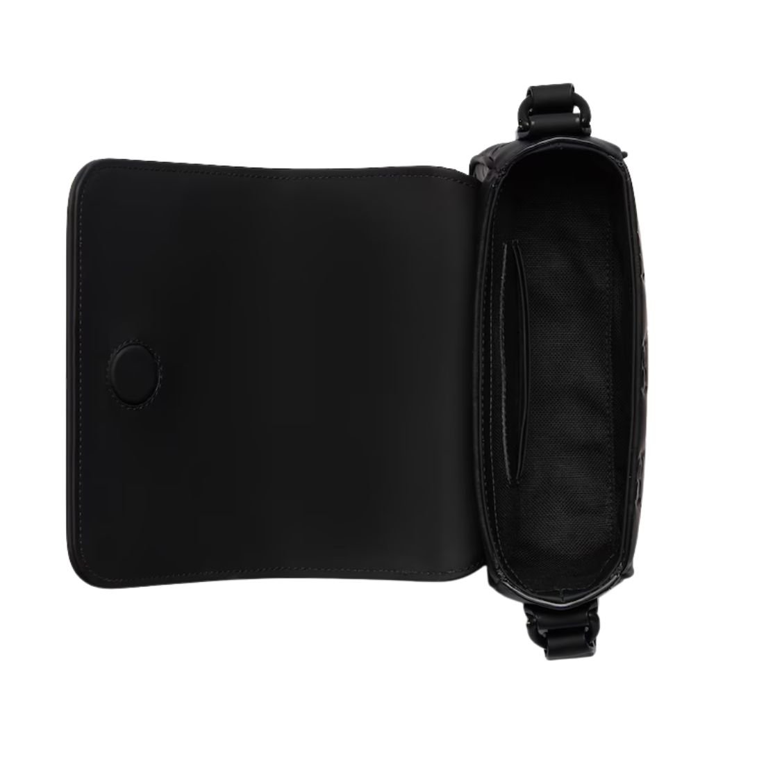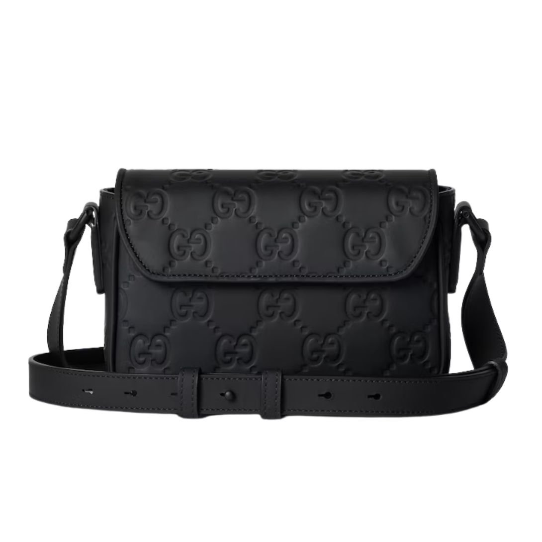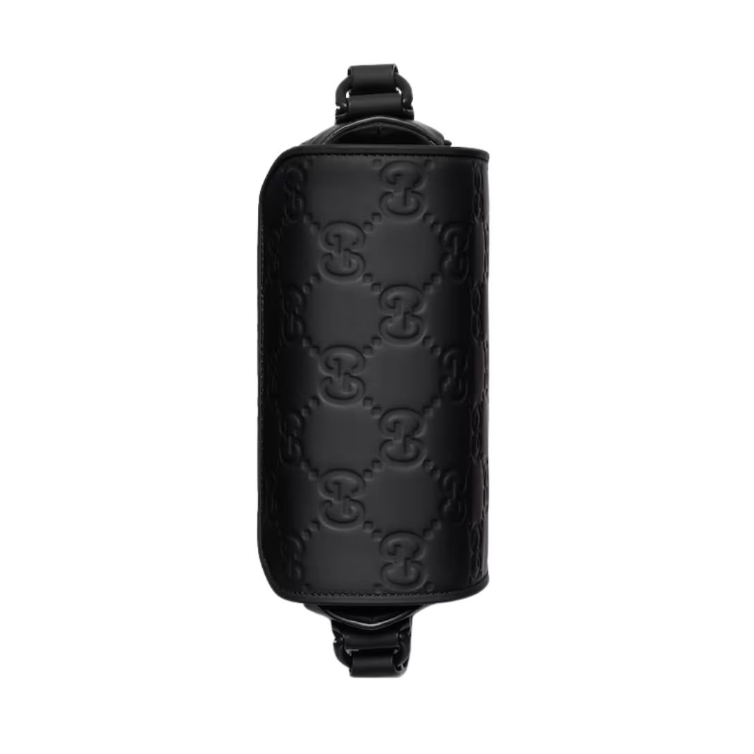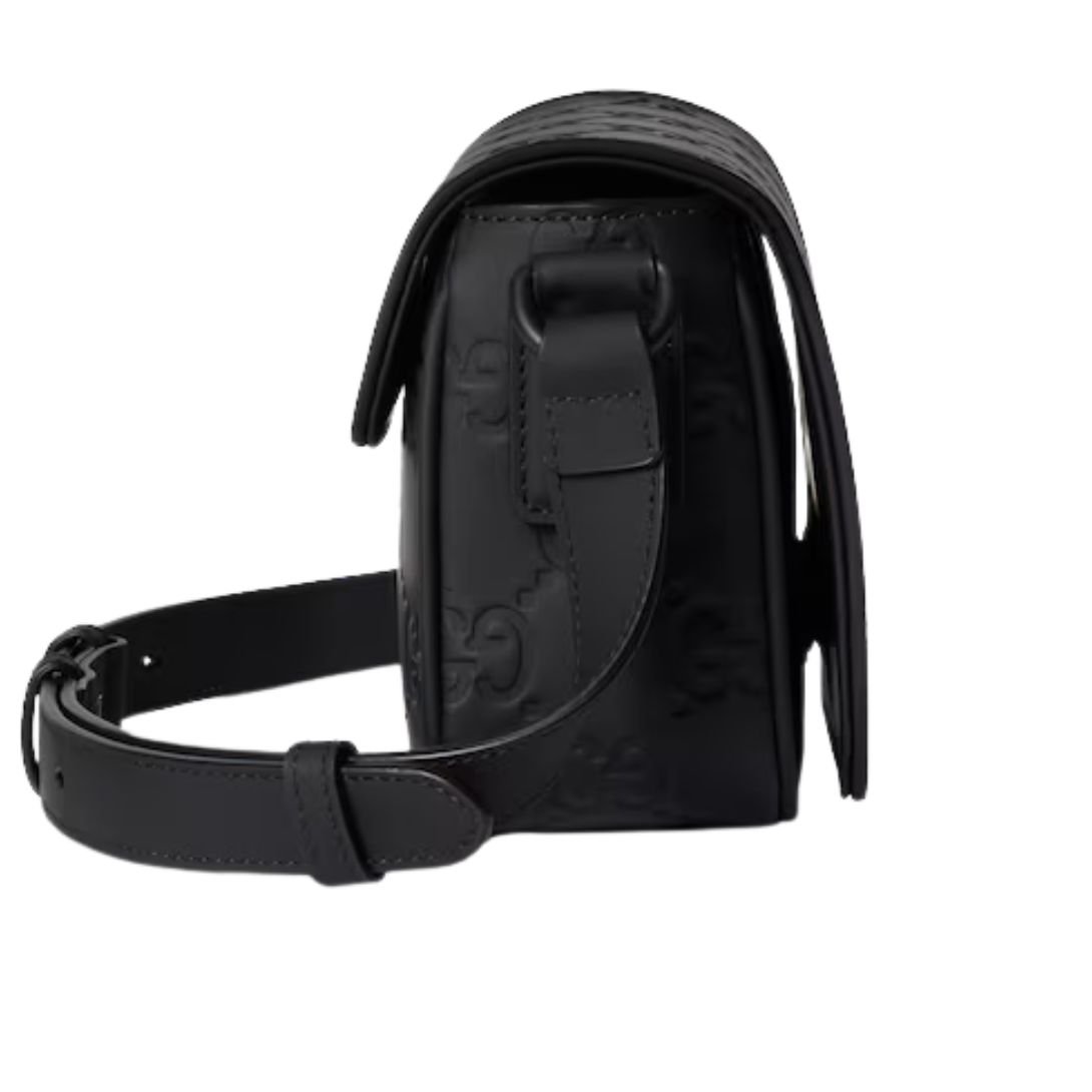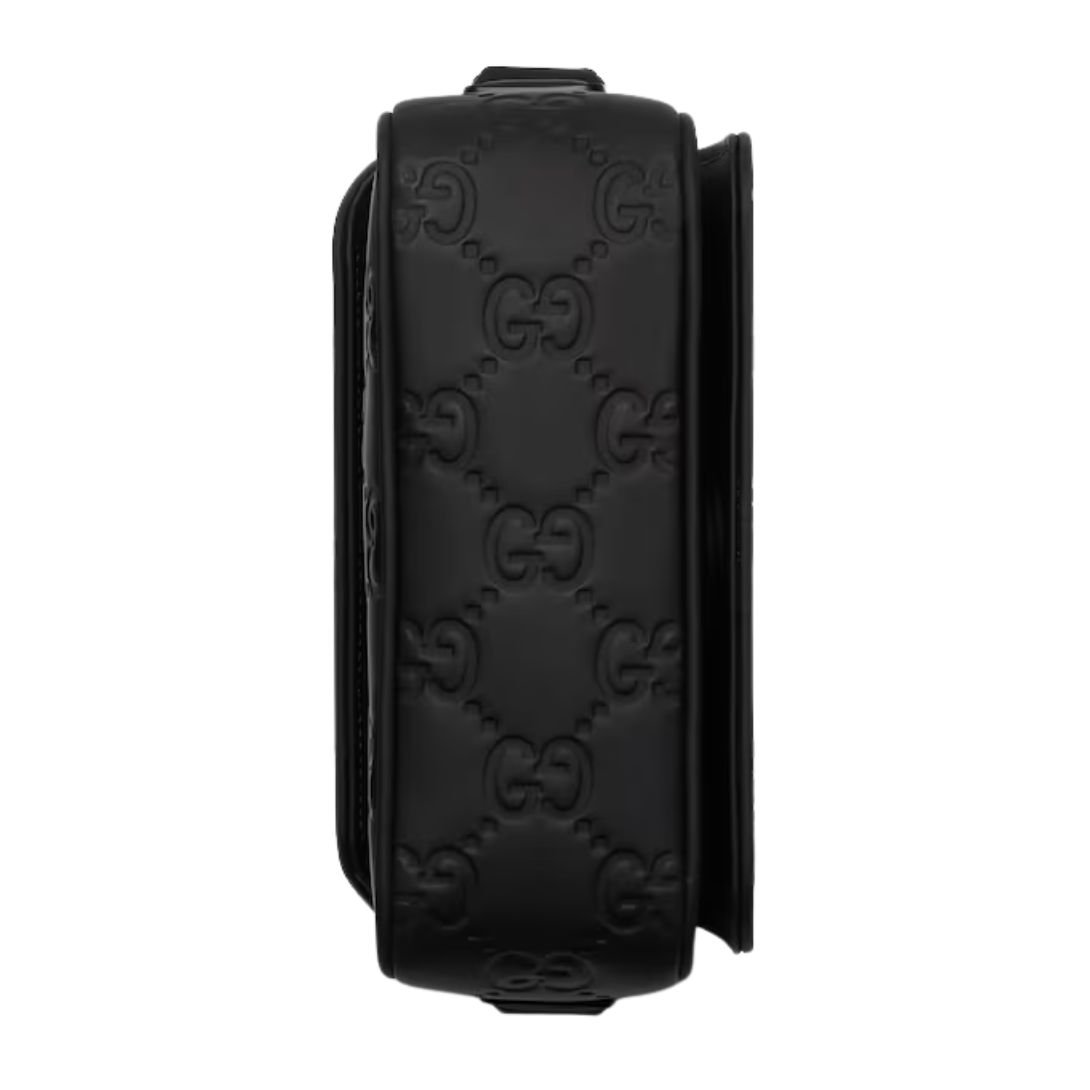 This mini bag combines functionality with a sleek, modern design. Crafted from black GG rubber-effect leather, it features two inside card slots and an adjustable shoulder strap, making it both a stylish and practical accessory for everyday use.
