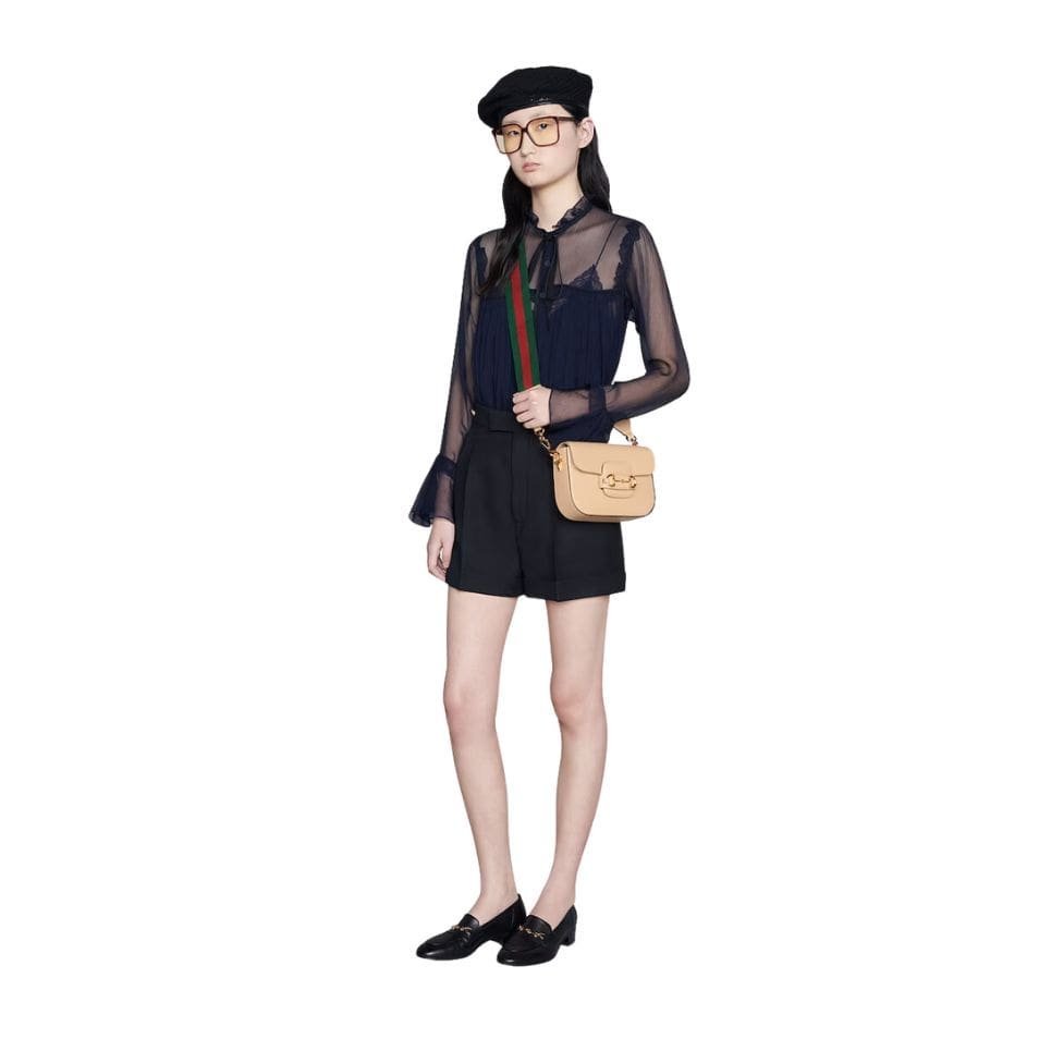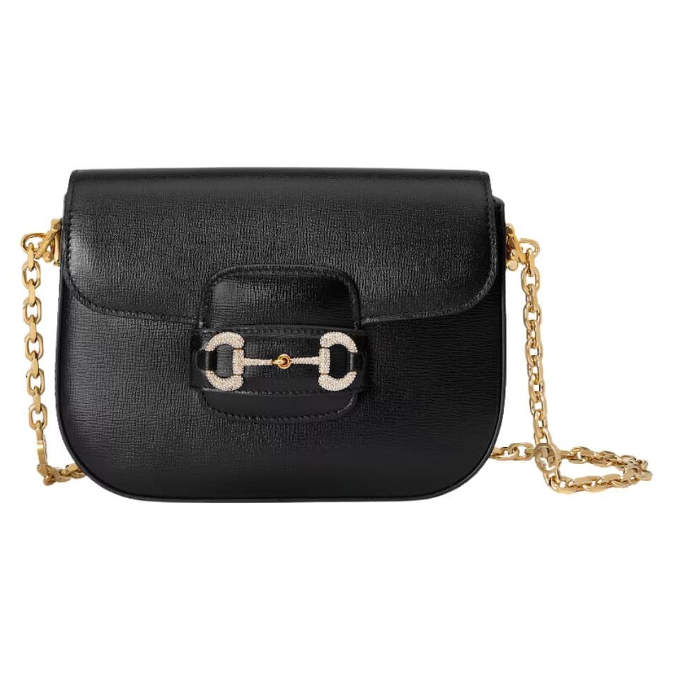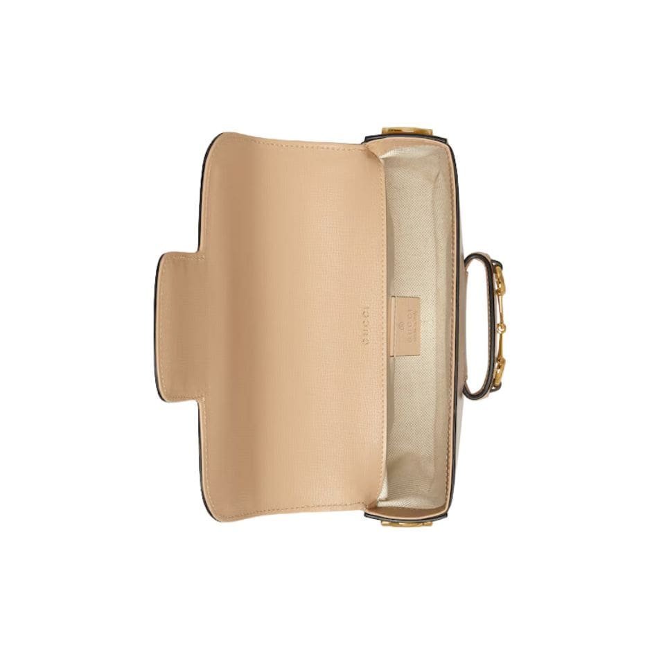 Measuring at a compact size, the Horsebit 1955 Mini Bag is perfect for those who appreciate a refined yet practical accessory. The exterior is made from high-quality leather, available in various shades, including classic black, pristine white, and rich brown, each exuding its unique charm. The leather is meticulously treated to achieve a smooth, supple finish that enhances its durability and timeless appeal. GUCCI HORSEBIT 1955 MINI BAG