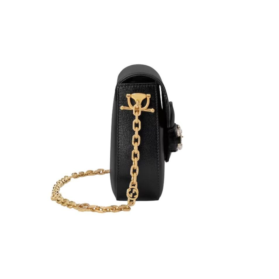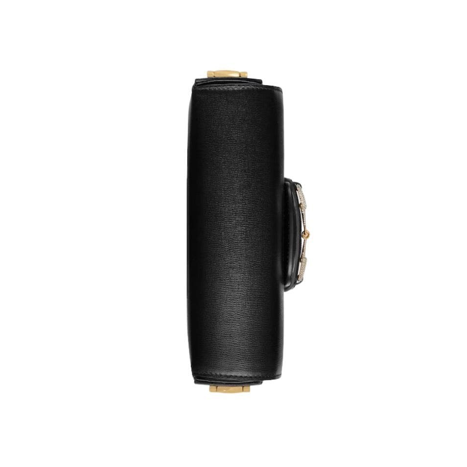 The bag’s design is both functional and stylish, with a structured silhouette that maintains its shape over time. The front flap is adorned with the distinctive Horsebit hardware in a polished gold-tone, adding a touch of opulence and instantly recognizable branding. The flap opens to reveal a well-organized interior lined with soft fabric, offering just enough space to carry essentials like a phone, wallet, keys, and a few cosmetics. GUCCI HORSEBIT 1955 MINI BAG