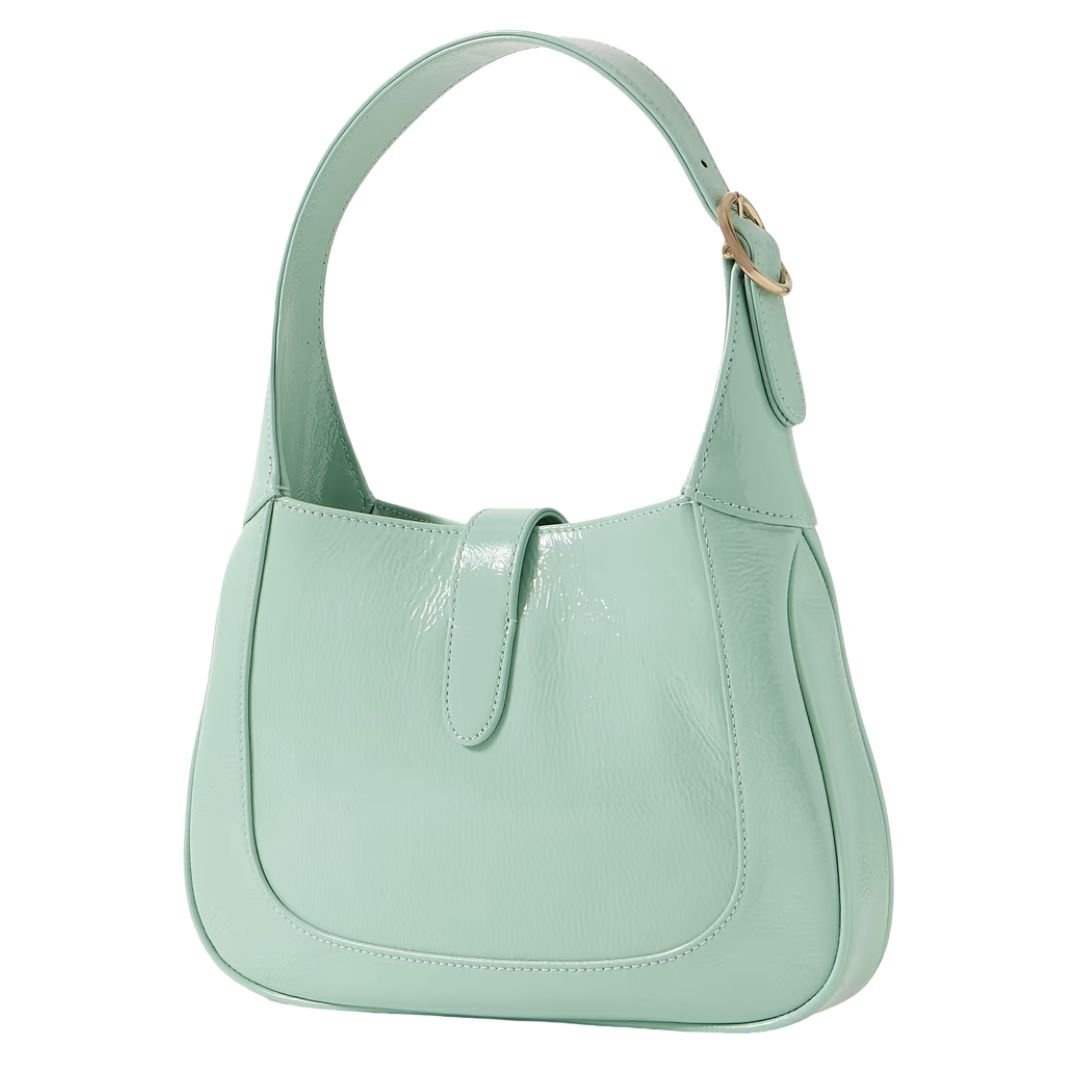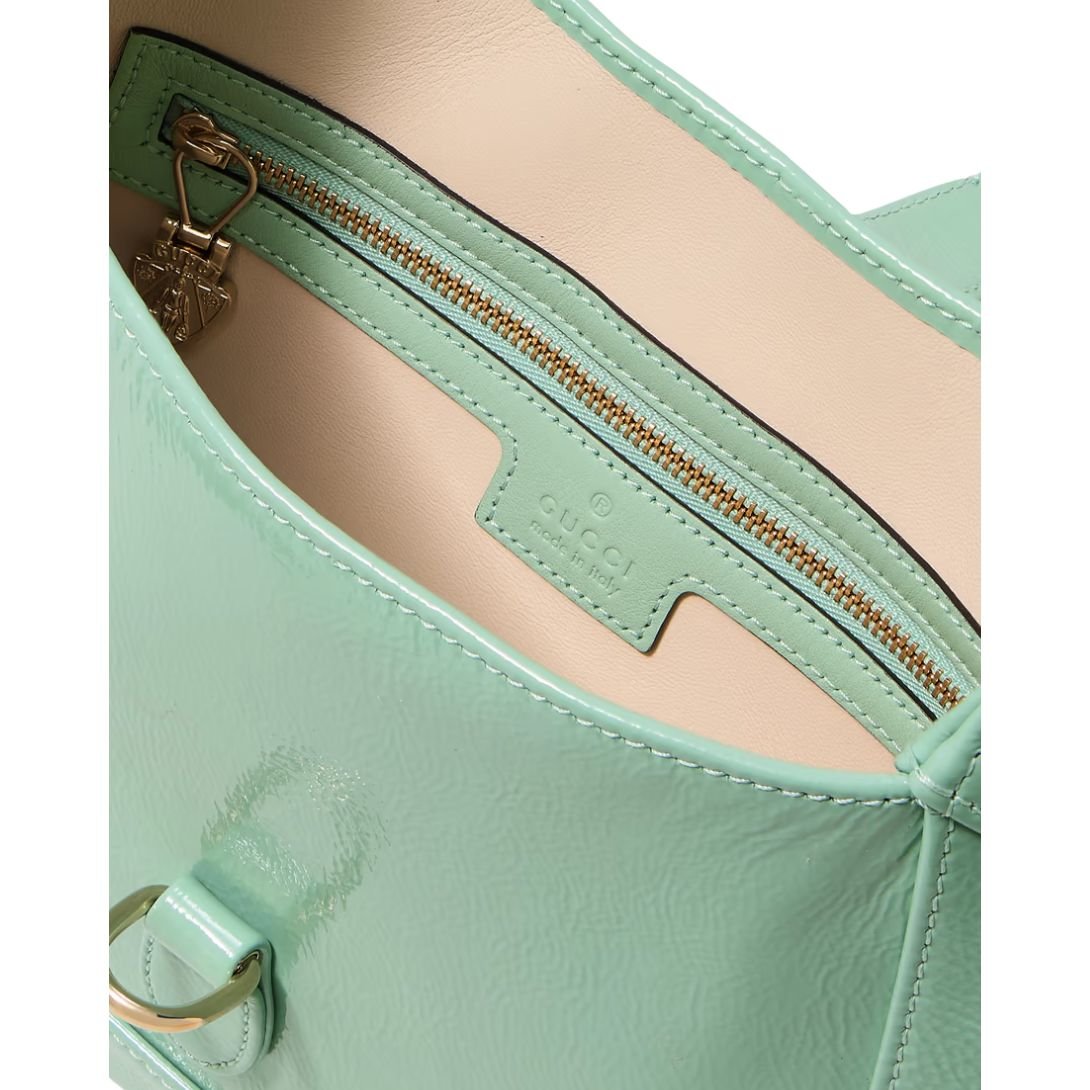 This Gucci bag is crafted from refreshing mint patent leather (calf), offering a sleek, glossy finish that adds a vibrant yet sophisticated touch to any look.