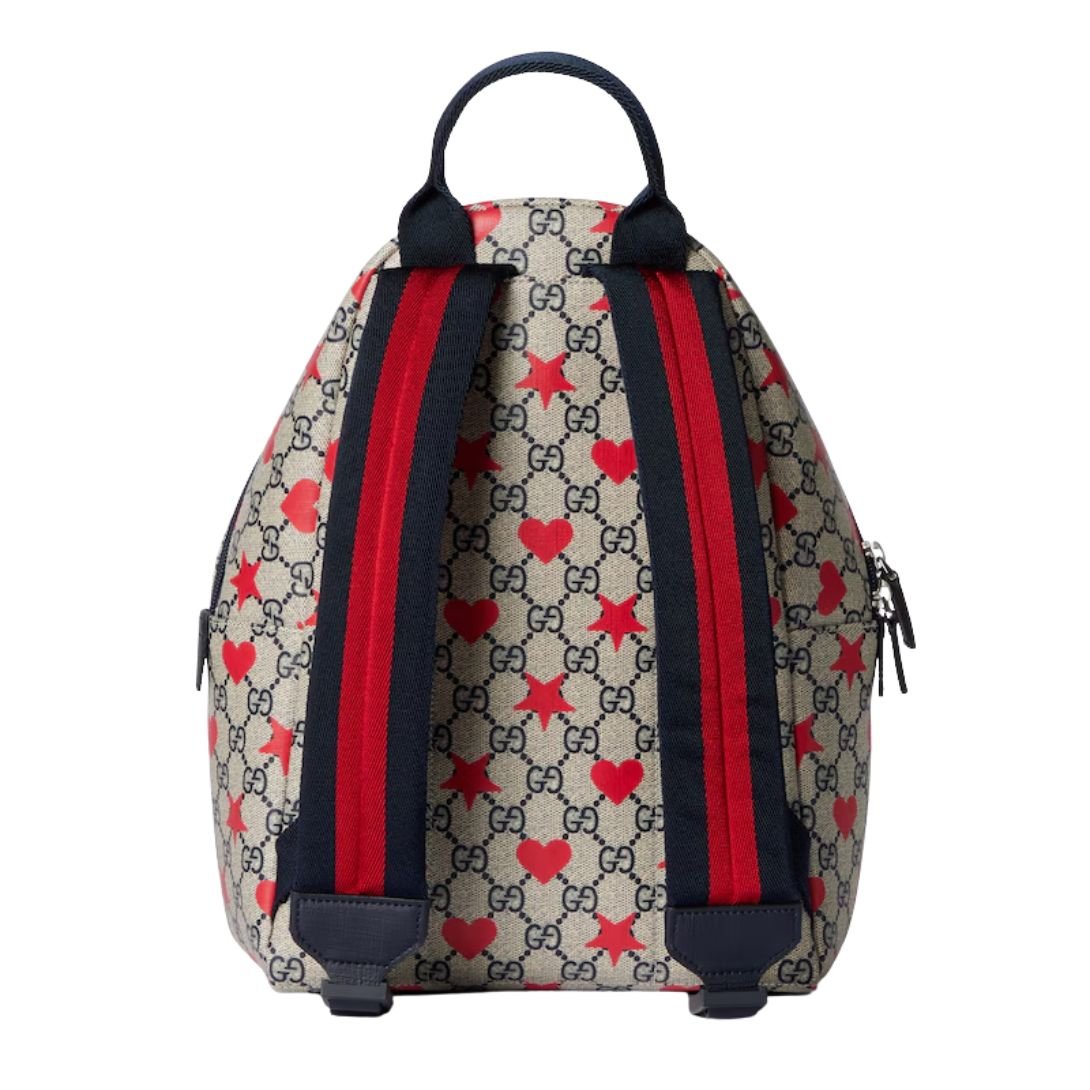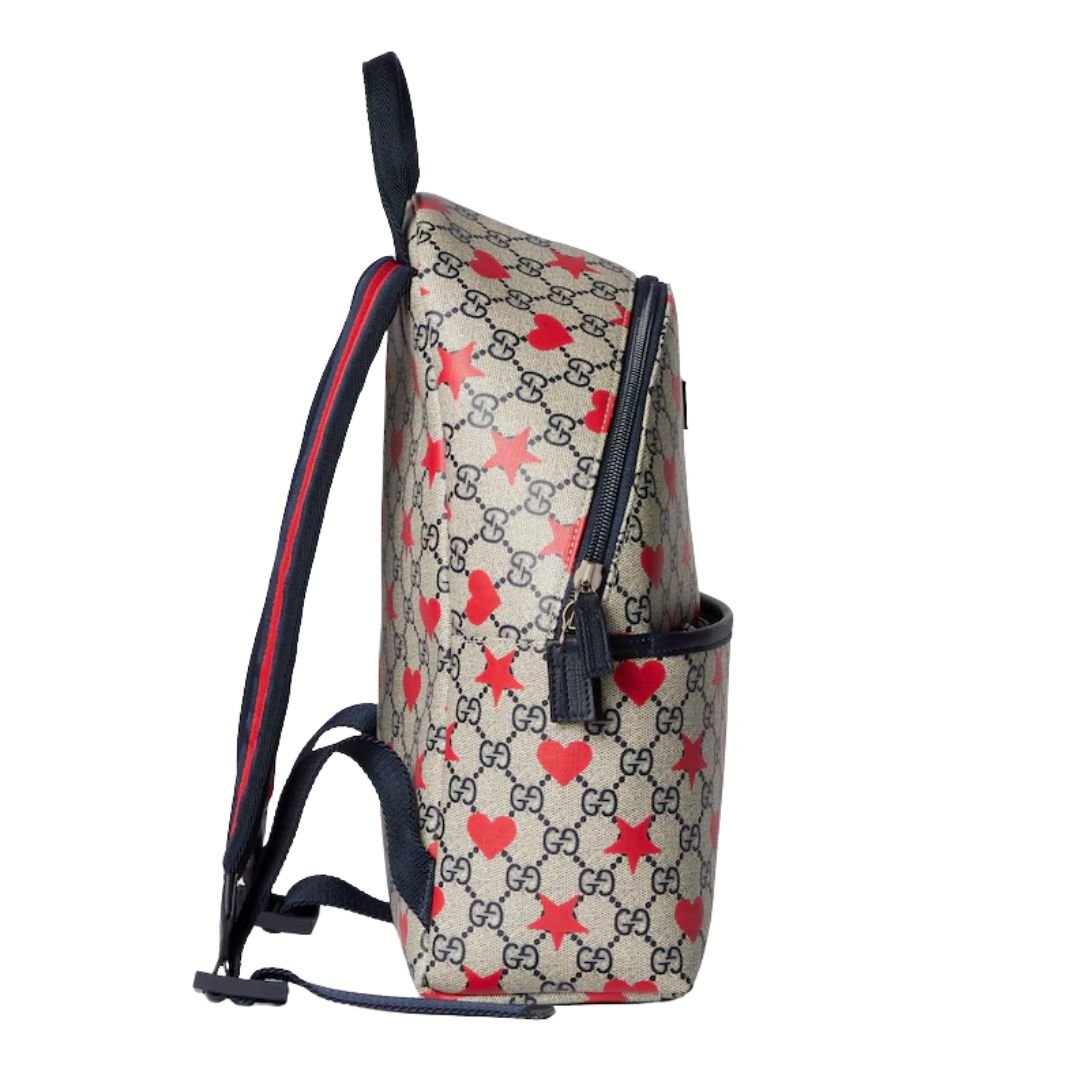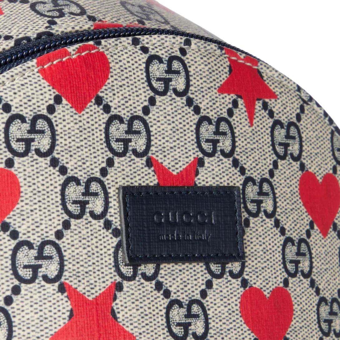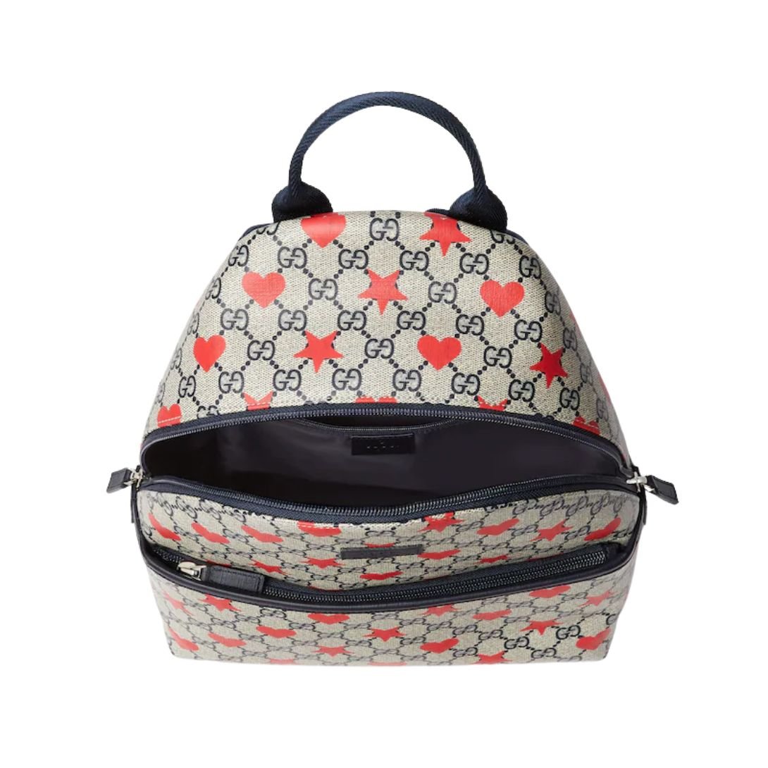 Made from beige and blue GG Supreme canvas, this backpack is complemented by a dark blue Supreme trim, adding a pop of contrast to the design. The allover stars and hearts print injects a sense of playfulness and youthful energy into the piece, while the “Gucci Made in Italy” leather label speaks to the quality craftsmanship behind it.