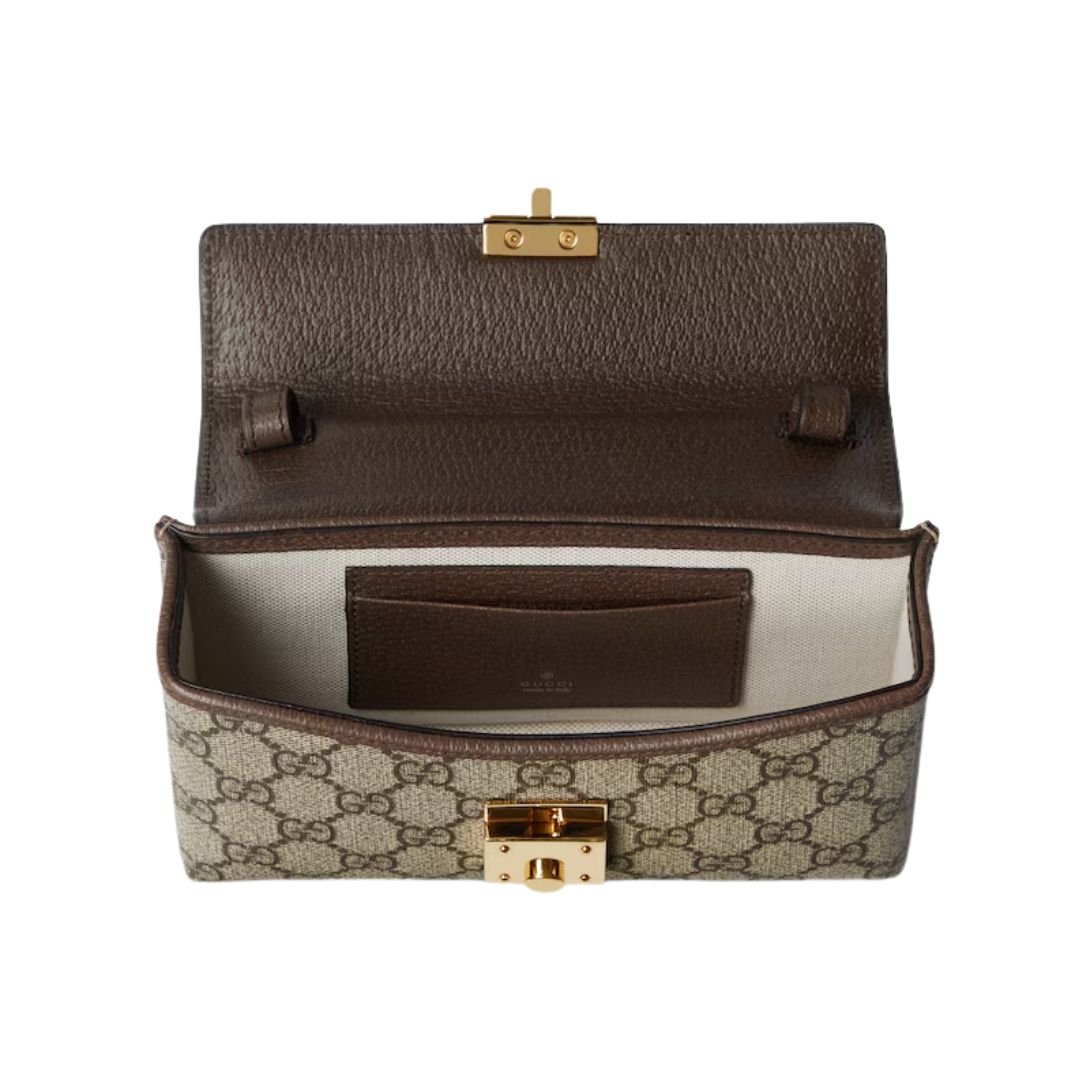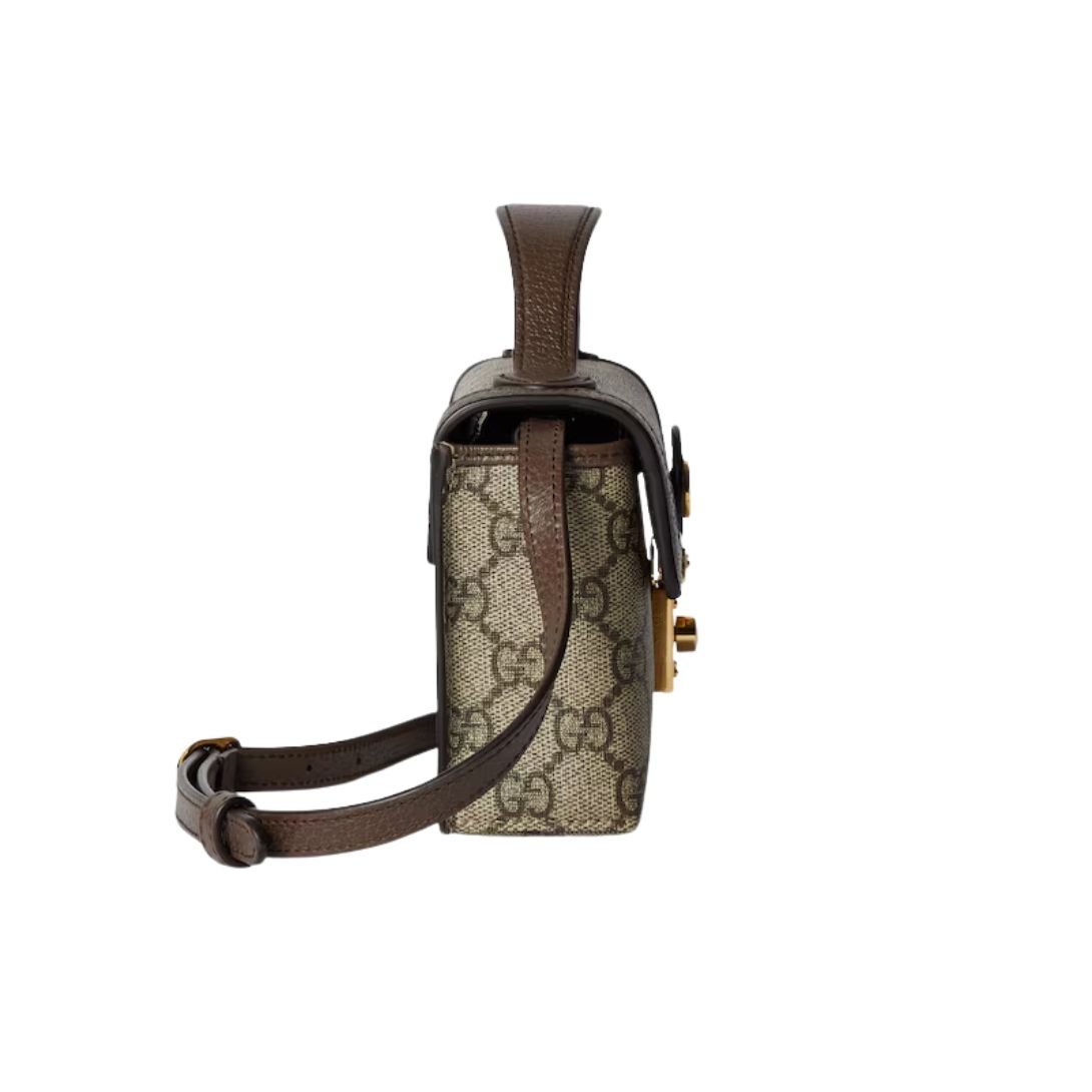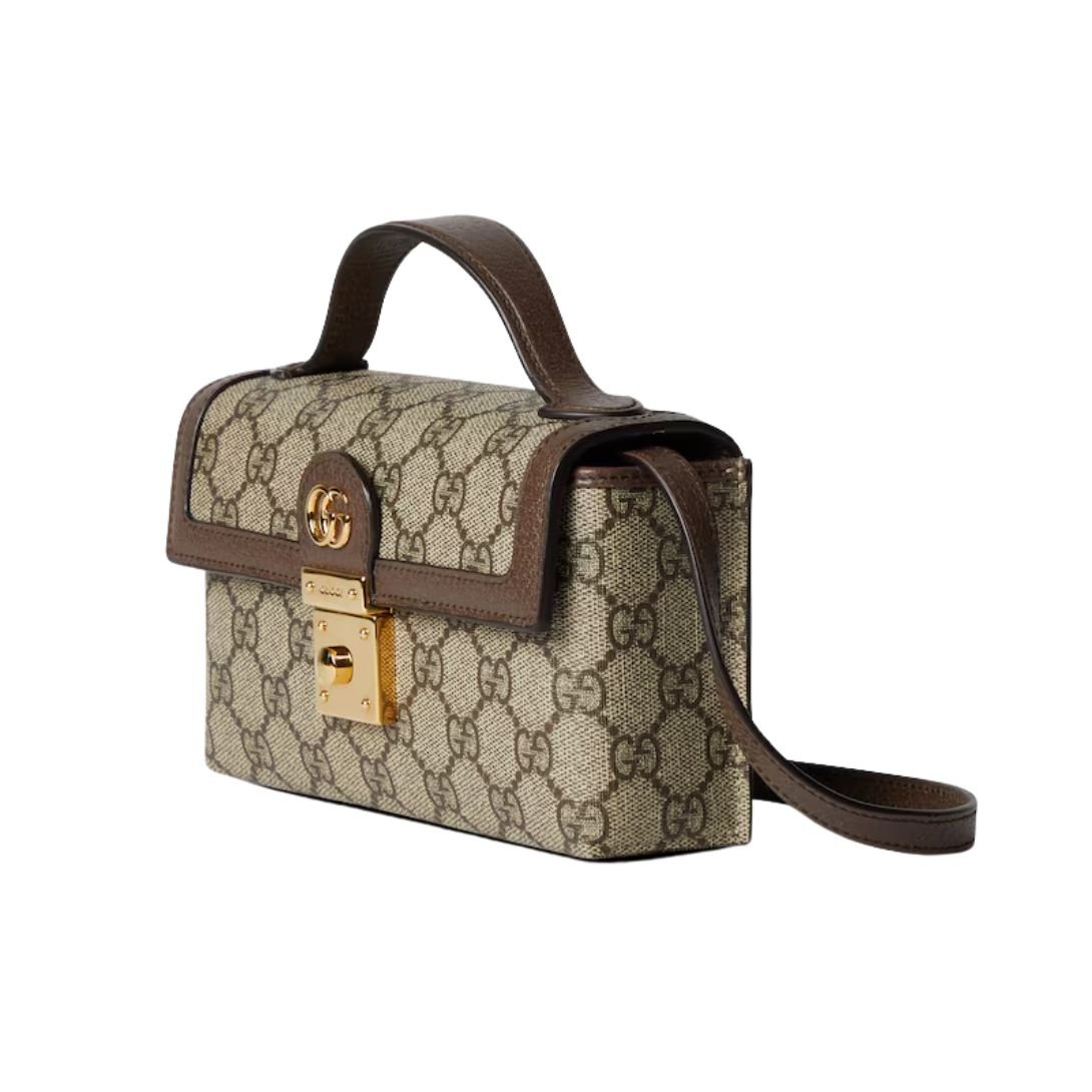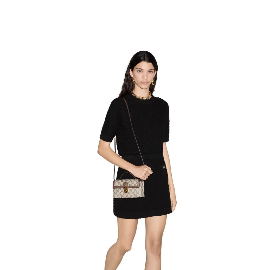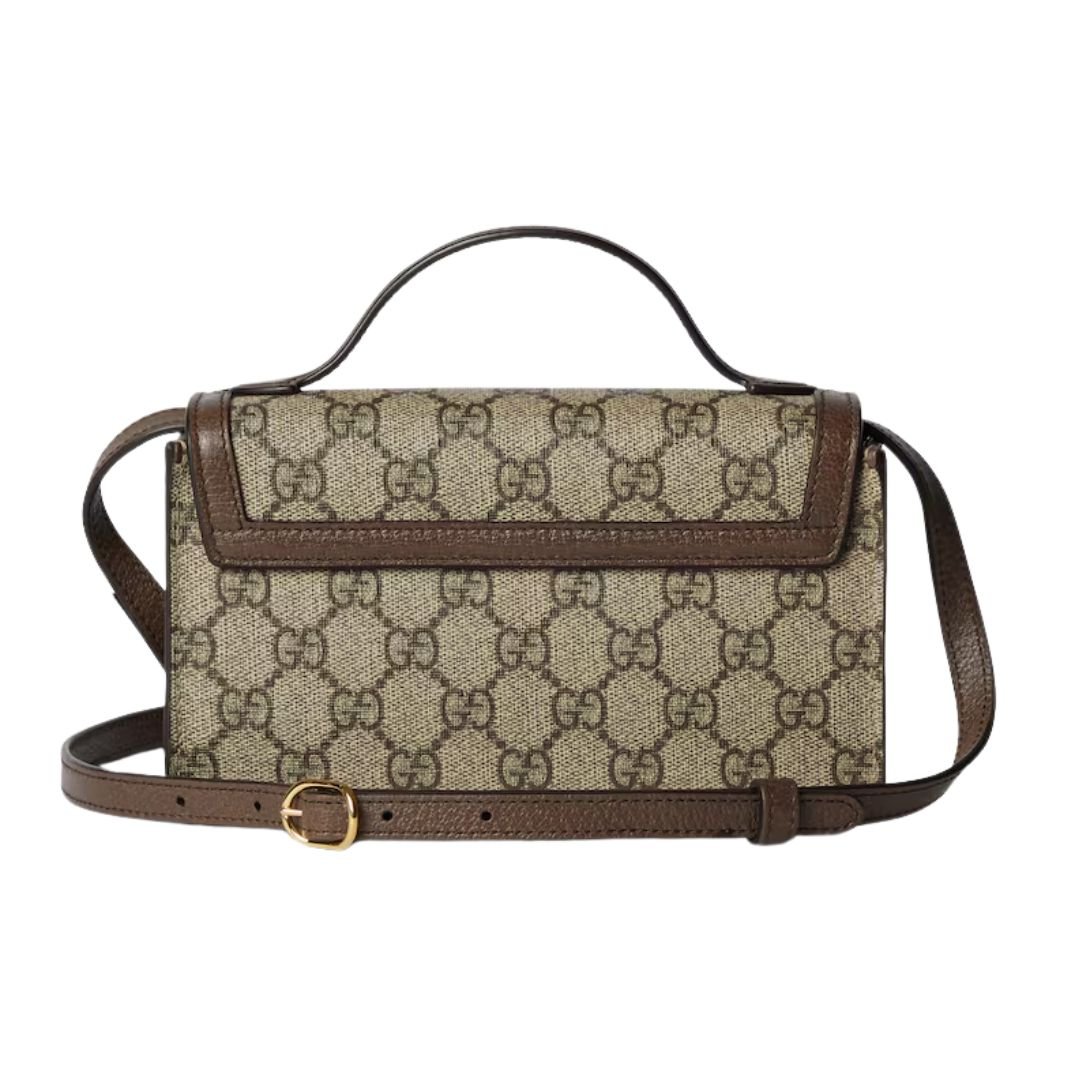 This mini bag is crafted from the historical beige and ebony GG Supreme canvas, a material that has become synonymous with Gucci’s heritage. The canvas is complemented by brown leather trim, creating a balanced and sophisticated look.