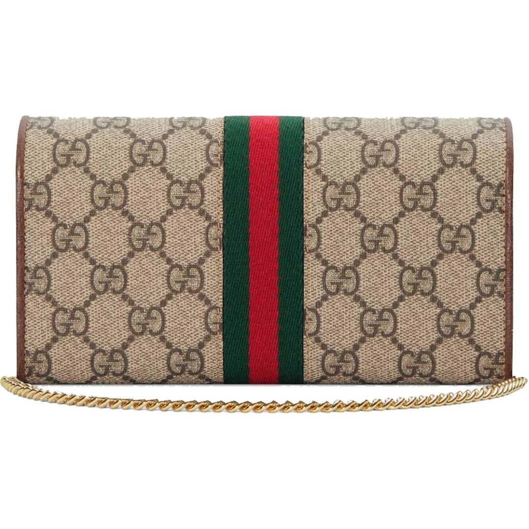 The Gucci Ophidia Wallet with Chain in Beige GG Supreme Canvas is a sophisticated accessory that seamlessly blends heritage elements with contemporary design. This versatile piece functions both as a compact wallet and a chic crossbody bag, making it a must-have for those who appreciate luxury and functionality.
