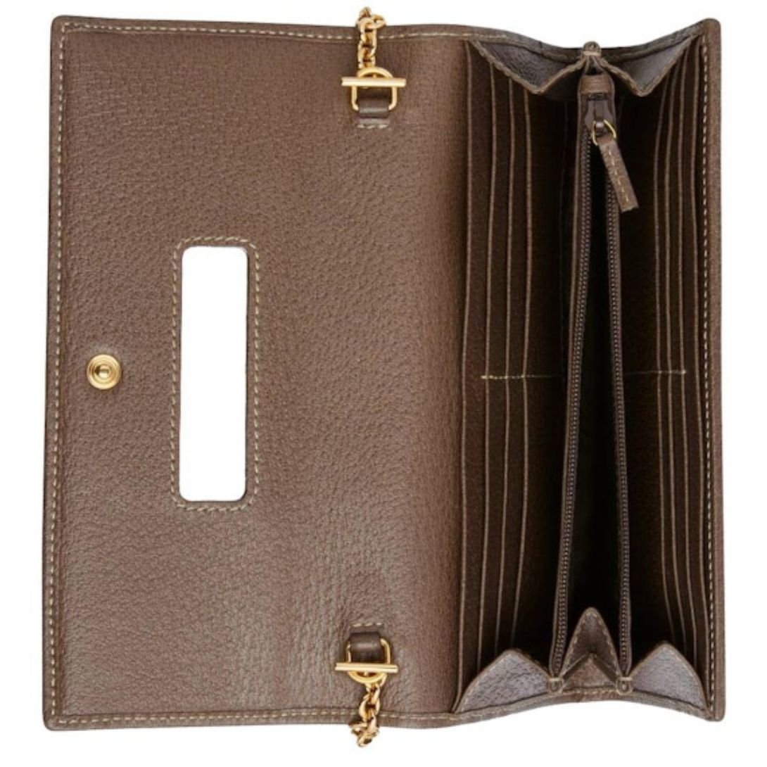 Crafted in Italy, this wallet features the iconic beige and ebony GG Supreme canvas, complemented by brown leather trim. The design is accented with the signature green and red Web stripe and a gold-toned Double G logo, symbolizing Gucci’s rich heritage. The removable chain strap offers a 60 cm drop, allowing for various styling options.