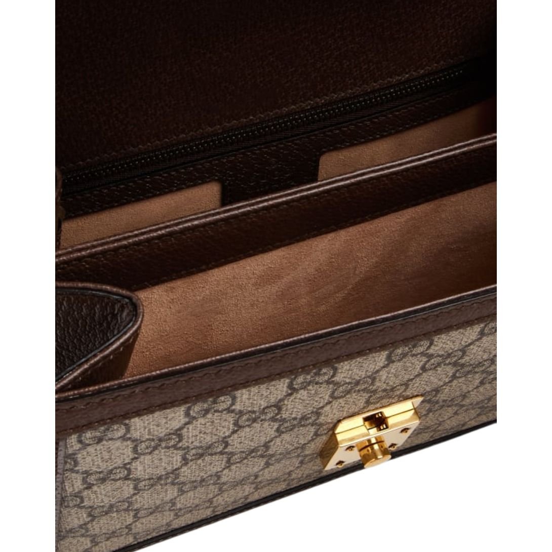 Crafted from the House’s iconic monogram canvas, this bag showcases the signature GG pattern that has become synonymous with Gucci’s heritage. The brown leather trim adds a refined contrast, enhancing the bag’s luxurious appeal.