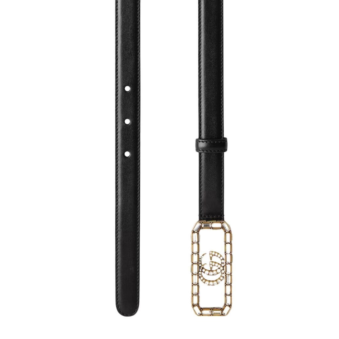 At the heart of our commitment lies the dedication to enriching women’s accessories with creative details and premium materials. Take, for instance, our Gucci Thin Belt With Crystal Double G Buckle In Black. Meticulously crafted from supple black leather, it exudes timeless elegance while boasting a touch of modern flair.