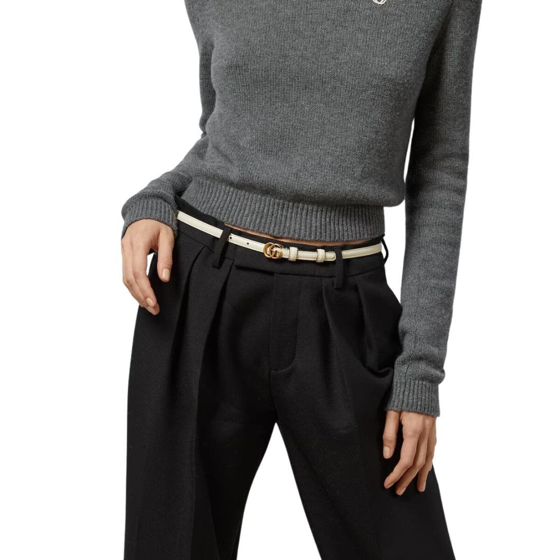 The focal point of the belt is the Double G buckle, crafted from gold-toned hardware for a sleek and modern finish. This iconic emblem adds a touch of opulence to the accessory, reflecting Gucci’s rich heritage and legacy.