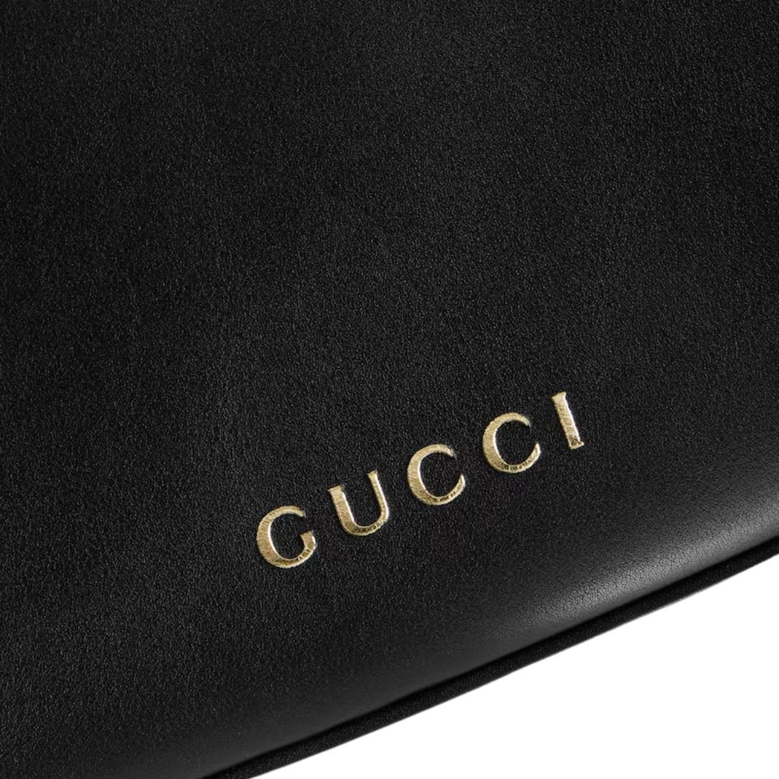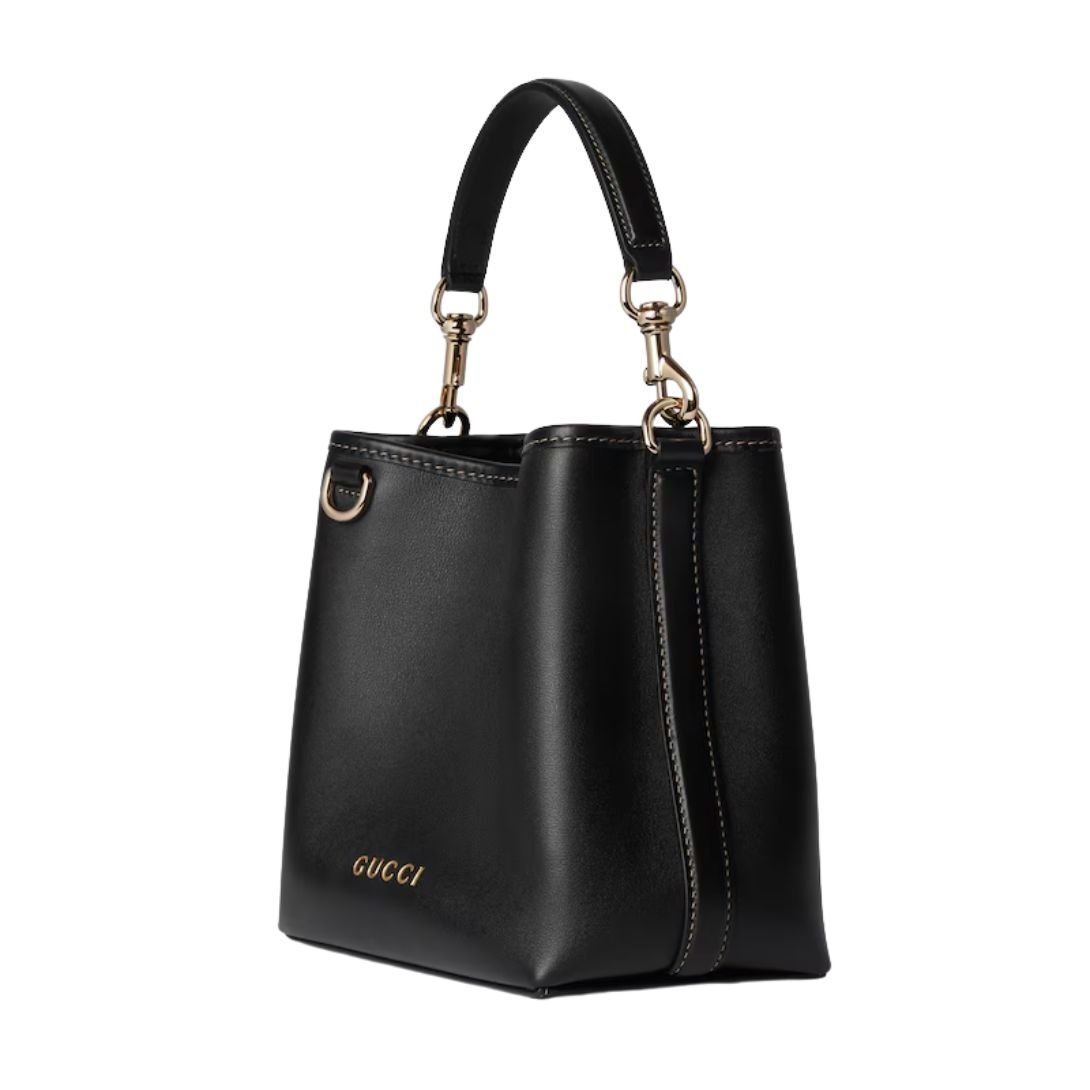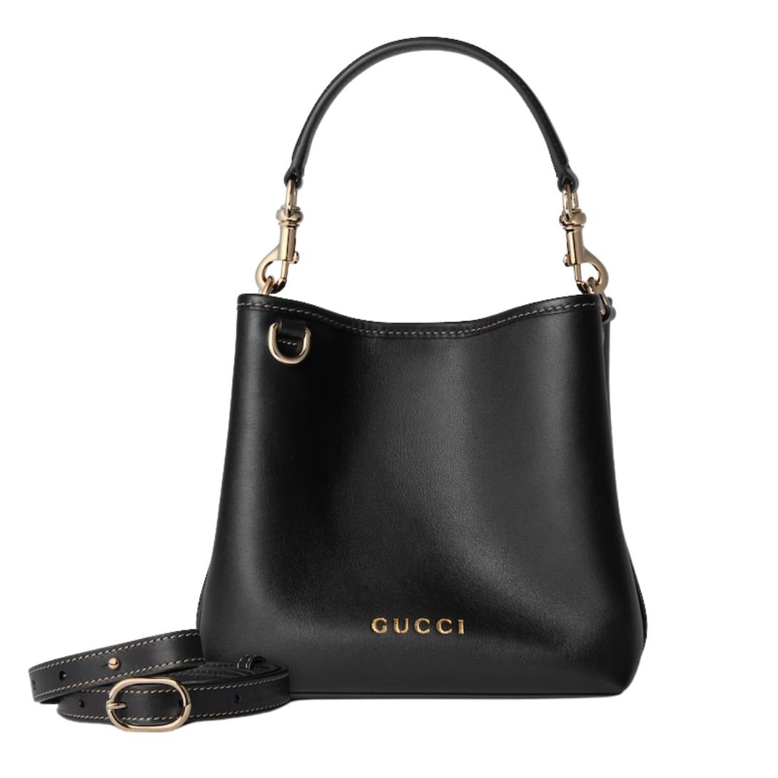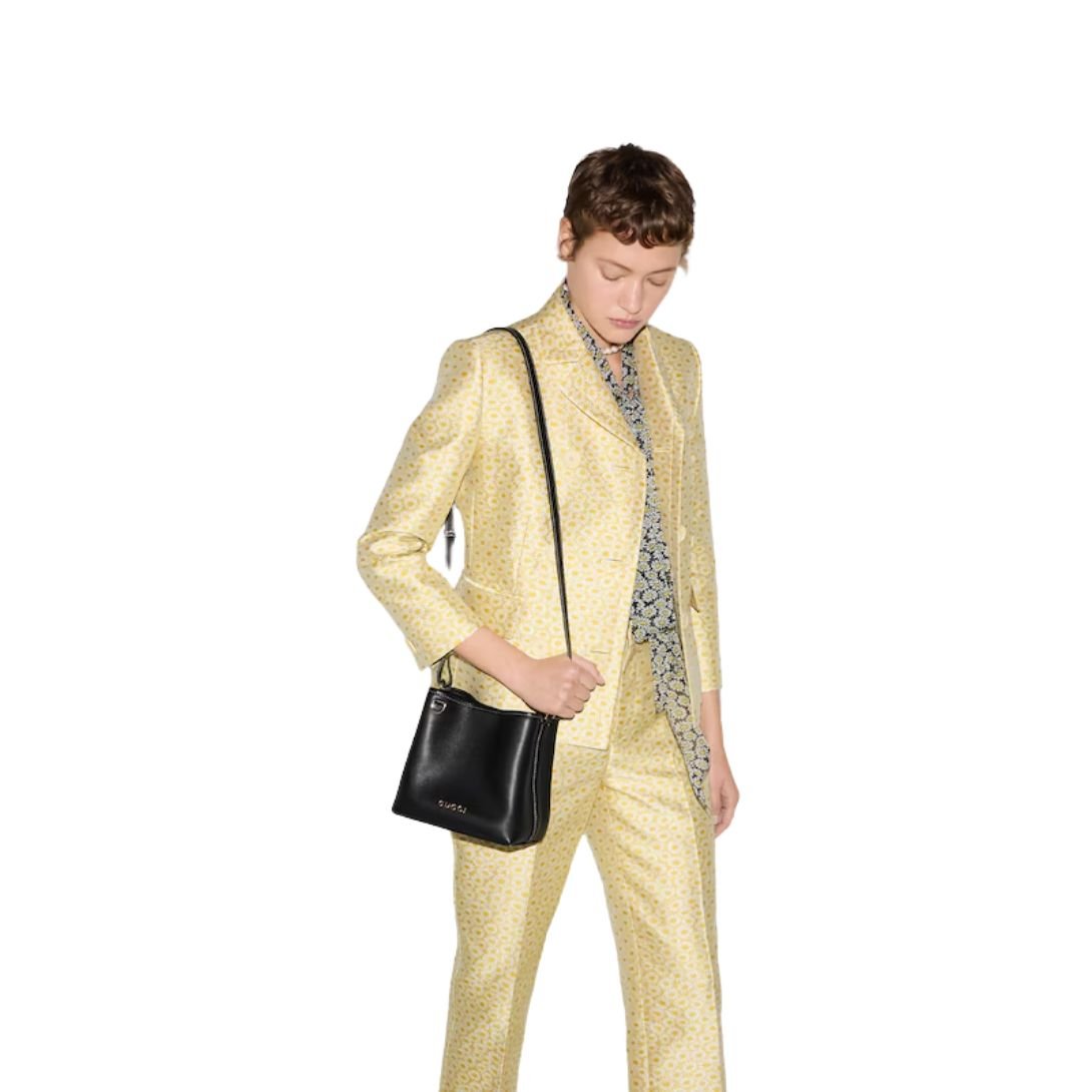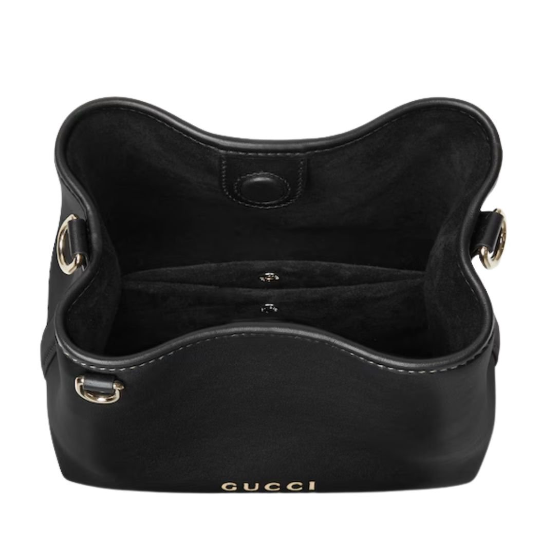 The GG Emblem collection reinterprets Gucci’s heritage with a fresh, modern twist. This bucket bag is crafted from smooth black leather and features light gold-toned hardware that complements the gold-embossed Gucci script, adding a touch of luxury and refinement to its minimalist design.
