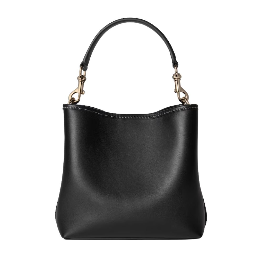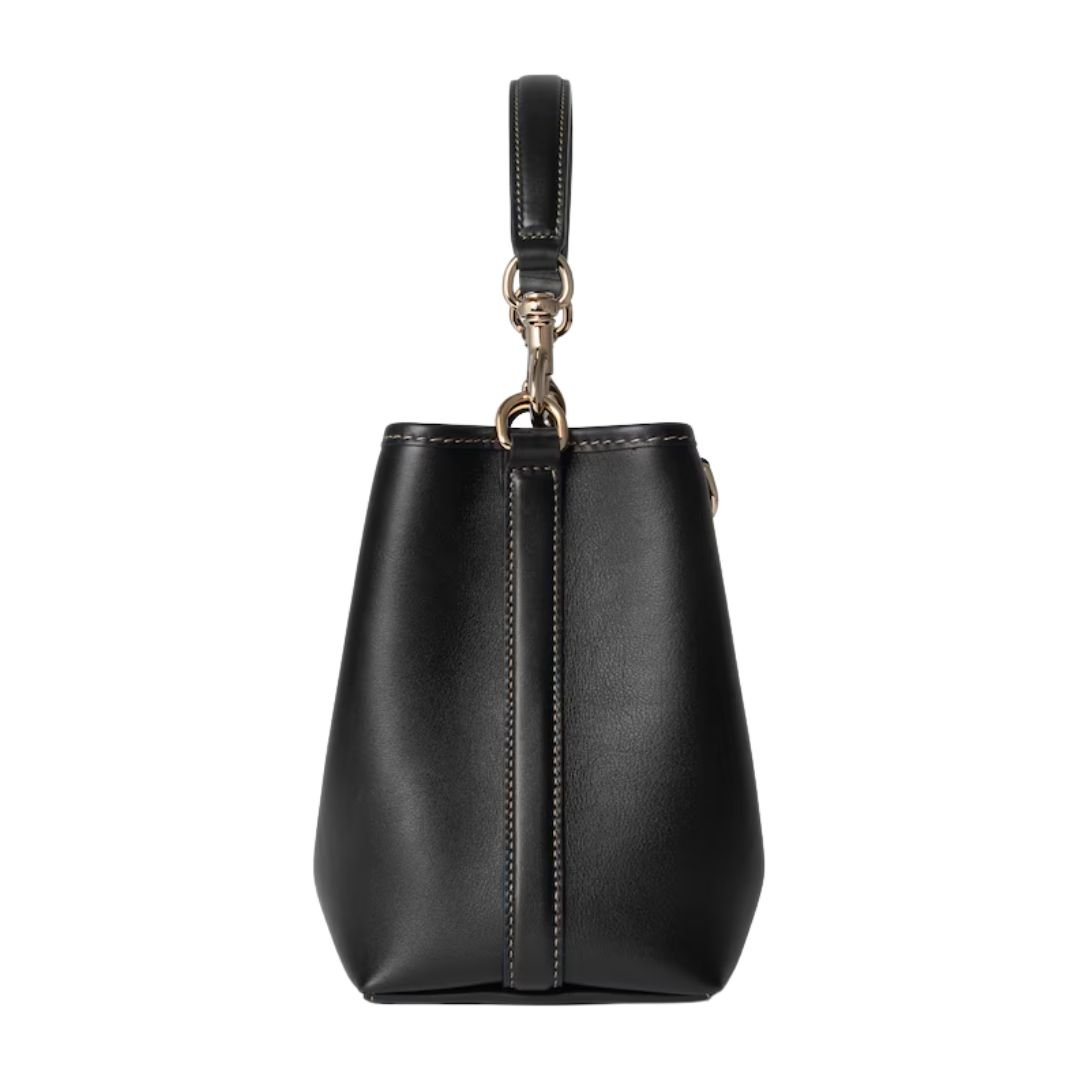 This bucket bag is designed with practicality in mind, featuring an interior with two compartments and a snap-button central compartment for organized storage. The top handle with hook closure offers an elegant carry option, with a drop of 14cm. Additionally, a detachable and adjustable leather shoulder strap provides a versatile carrying option with a length of 107-114cm and a 52cm – 57.5cm drop.