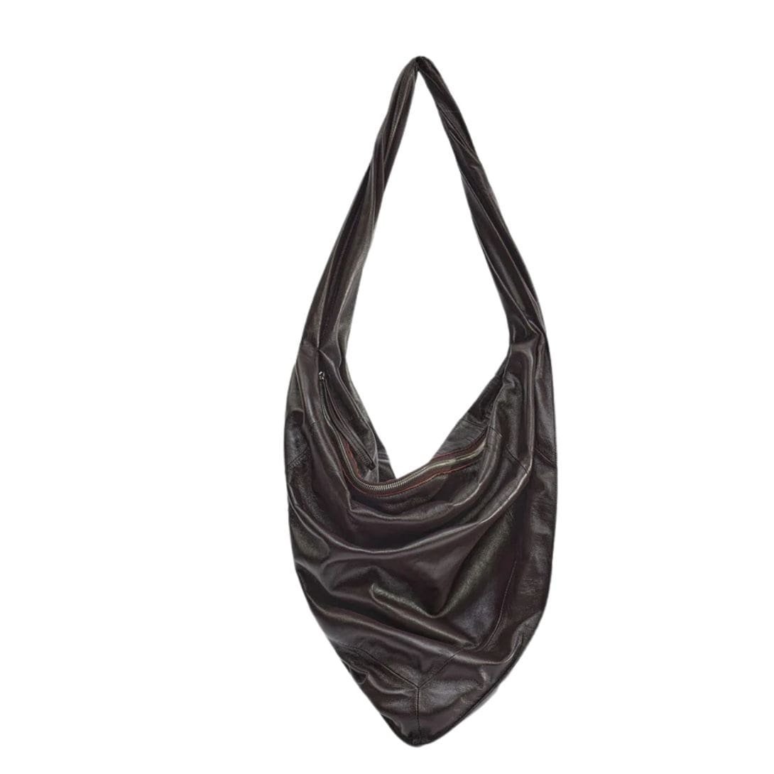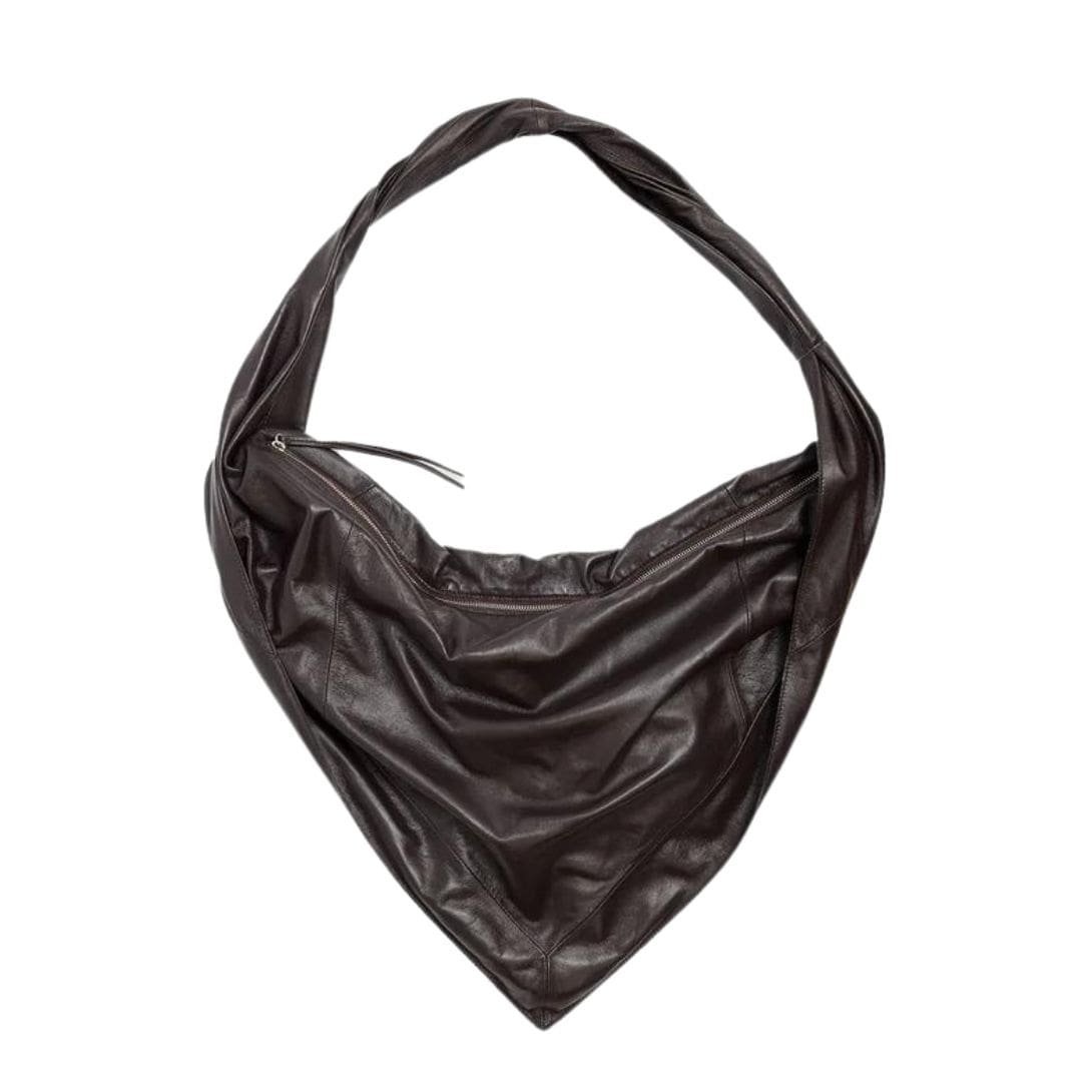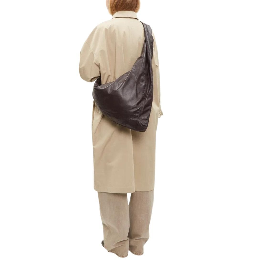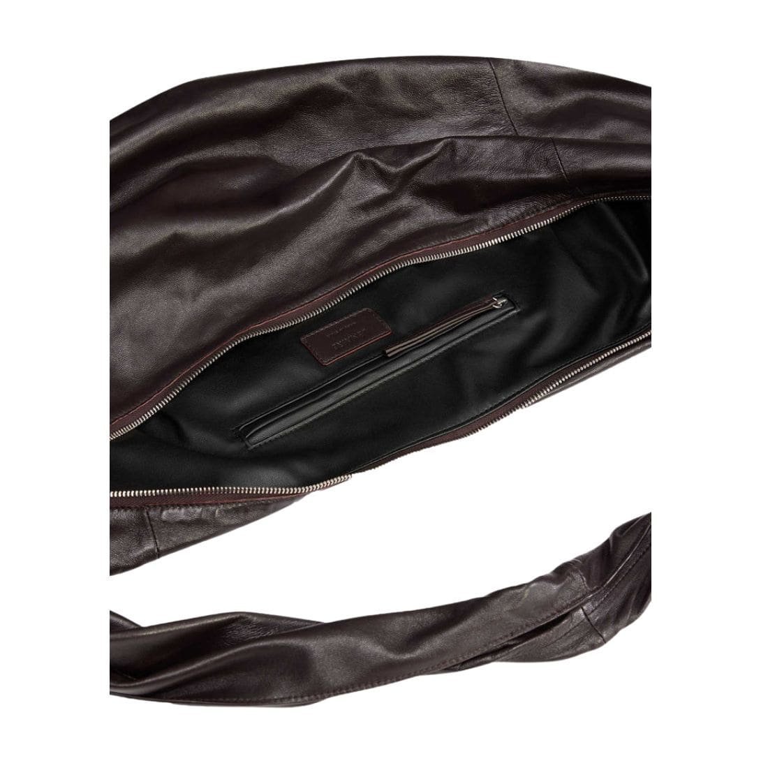 La Garconne Lemaire Scarf Bag Features an oversized scarf silhouette in espresso brown smooth nappa leather with a shiny finish. It includes a twisted strap, a tassel zip-top pull, and silver-tone metal hardware at the zip-top closure. The bag has a single interior pocket and is fully lined in contrasting black fabric.