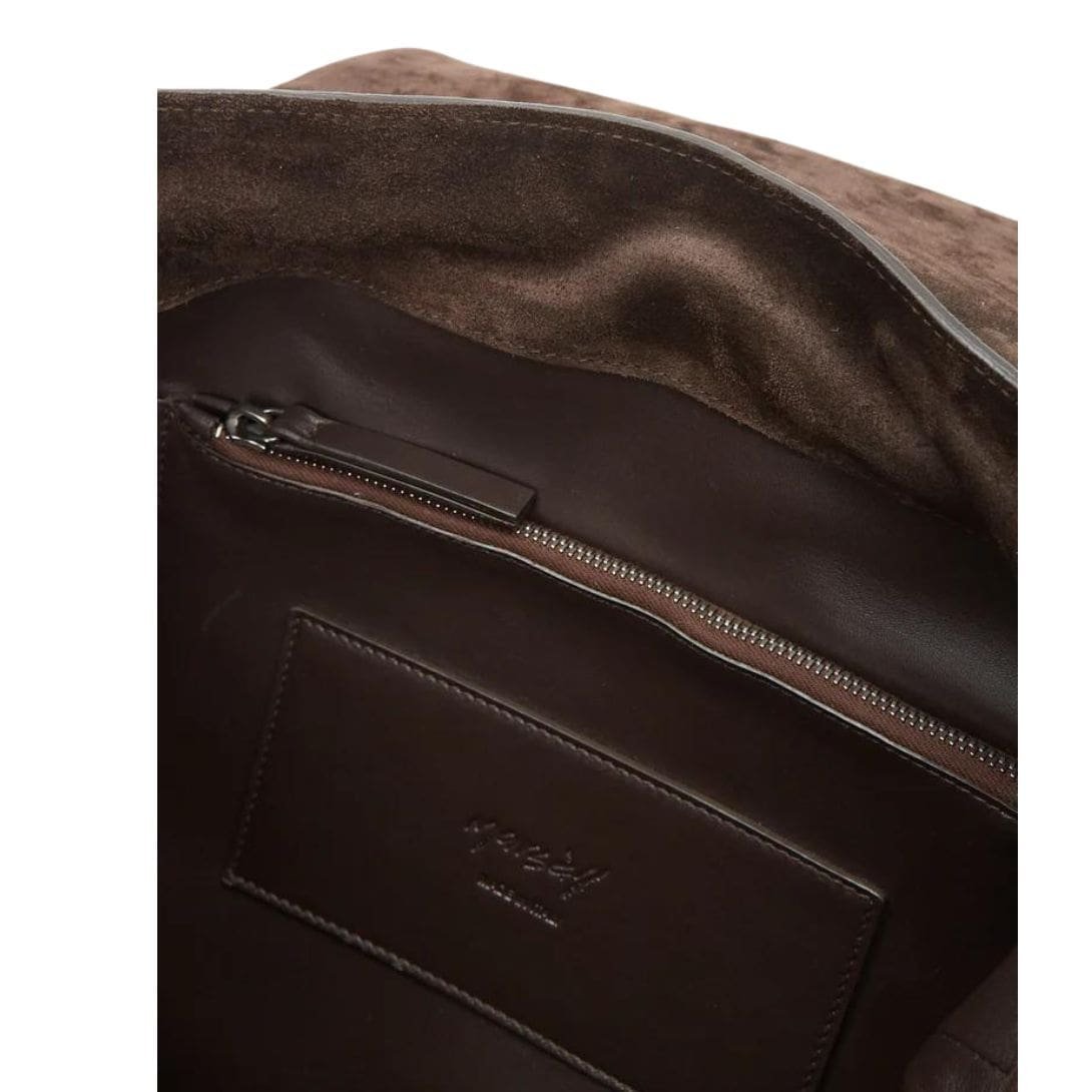 Marsèll presents a dark brown La Garconne Marsèll Patta Zaino Backpack crafted from suede leather, featuring a square fold-over top with a drawstring closure and knotted ends. It includes a tonal suede leather top handle, padded adjustable shoulder straps, and a single interior zipper pocket. The backpack is lined in tonal fine leather.